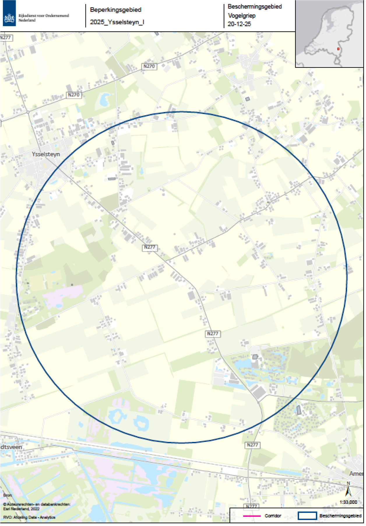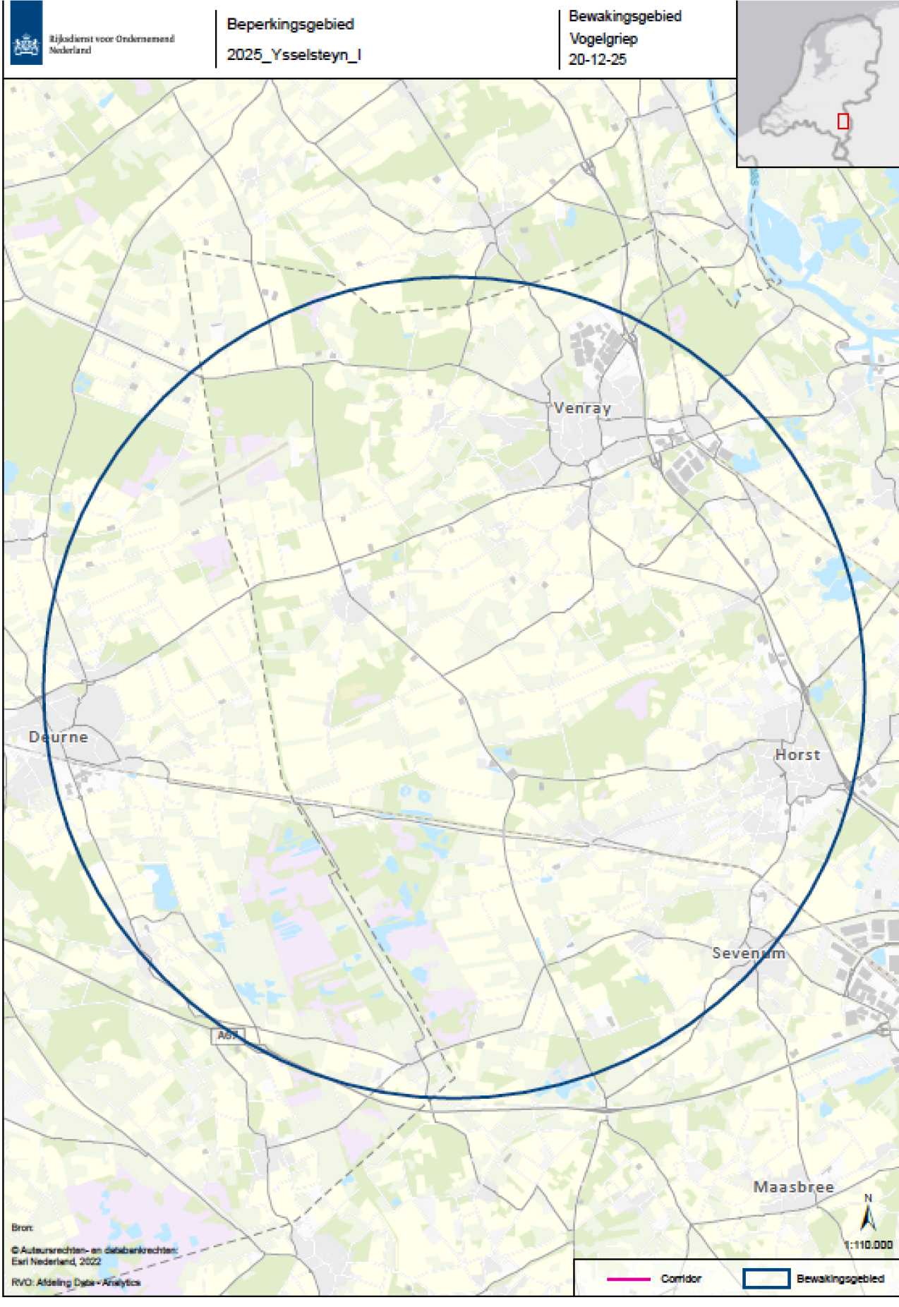 De beschermingszone en bewakingszone zijn respectievelijk het gebied met een straal van 3 en 10 kilometer rond de besmette inrichting, zoals aan de hand van een plattegrond is aangeduid in de bijlage. Een inzoombare, gedetailleerde kaart van die zone is beschikbaar op de website van de Rijksdienst voor Ondernemend Nederland (RVO) (GeoWeb).