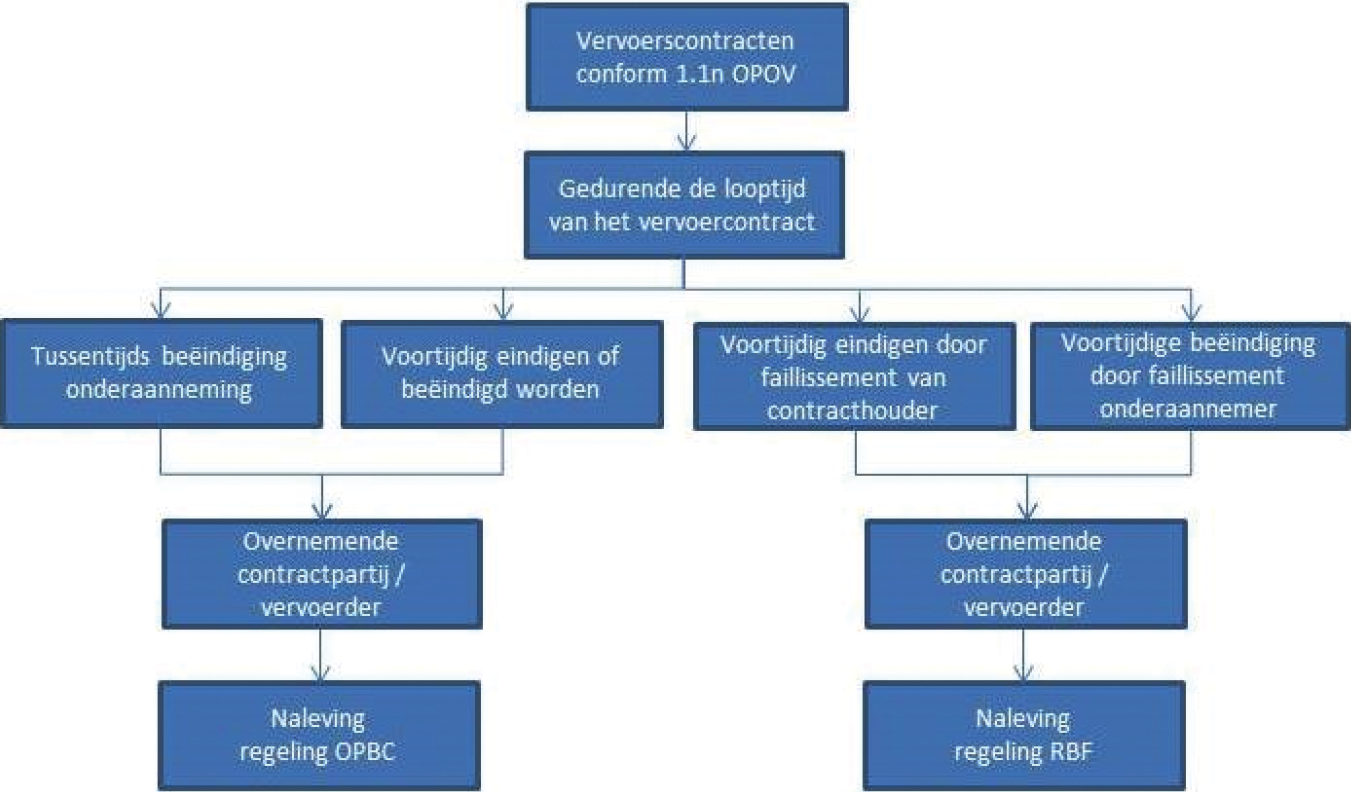 De regeling “Regeling bij faillissementen (RBF)” is van toepassing bij faillissementen, waarbij vervoerscontracten zijn betrokken, waarop de OPOV-regeling van toepassing was. Deze regeling houdt in dat een werknemer die gedurende 3 kalendermaanden voor de derde partij of contractpartij daadwerkelijk heeft gewerkt, deze automatisch een arbeidsovereenkomst krijgt waarvan de omvang gelijk is aan het gemiddeld aantal gewerkte uren en waarvan het type arbeidsovereenkomst gelijk is aan de arbeidsovereenkomst die werknemer had bij de failliete vervoerder/contractpartij.