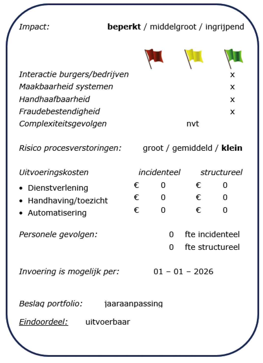 Ten aanzien van de onderhavige maatregel is een uitvoeringstoets gedaan. Daaruit blijkt dat de maatregel met ingang van 1 januari 2026 kan worden uitgevoerd.
