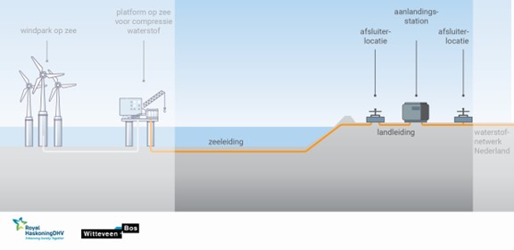 Naast de mogelijkheid om de windenergiegebieden aan te sluiten op het vasteland met kabelverbindingen, kan dit ook met waterstofleidingen. Binnen dit Programma is onderzocht welke routes voor de aanleg van nieuwe waterstofleidingenleidingen mogelijk zijn om waterstof aan te landen, voor het geval het hergebruiken van bestaande gasleidingen niet mogelijk is. Buiten dit Programma onderzoekt het Rijk in een apart proces of en hoe bestaande gasleidingen kunnen worden hergebruikt voor waterstof. 10 Als alternatief is onderzocht of TNW met (elektrische) kabelverbindingen kan worden aangesloten op het landelijk hoogspanningsnet. Dit alternatief kan worden gebruikt als het helemaal niet mogelijk is om een bestaande gasleiding te hergebruiken of een nieuwe waterstofleiding aan te leggen of als blijkt dat het waterstofdemonstratieproject 11 om andere redenen in een andere vorm of in het geheel niet door kan gaan.
