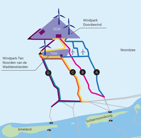 Voor kabelverbindingen geldt dat er voor Doordewind één Waddengebiedroute zorgt dat de wind op zee op tijd aanlandt: de Schiermonnikoog Wantijroute (VII) met bijbehorende landroute. De route is tijdig realiseerbaar en sluit aan op de nationale doelen en regionale ambities voor wind op zee en de energietransitie. In dialoog met de omgeving is gewerkt aan oplossingen om deze route met respect voor de natuur en perspectief voor de landbouw verder te ontwikkelen. Door deze inzichten is onder andere gewerkt aan het minimaliseren van de effecten op het Waddengebied door routeoptimalisaties toe te passen (zoals het vermijden van de waardevolste delen), speciale technologie zoals een Wadtrencher te gebruiken en door onder Schiermonnikoog door te gaan met een gestuurde boring zodat de stabiliteit van het eiland geborgd blijft en de natuur minimaal wordt aangetast. Daarbij is ook in gezamenlijkheid met agrariërs en landeigenaren onderzoek gedaan naar de effecten op onder andere het risico van de versnelling van verzilting op landbouw, waarbij - naast de nu onderzochte aanlegmethode van open ontgraving - het principe van de inzet van gestuurde boringen op land leidend is, tenzij dit niet mogelijk is of in overleg met landeigenaren er open ontgraving gewenst is. Om vanaf de Waddenzee de verbinding te maken met het windenergiegebied wordt de Noordzeeroute D gekozen.