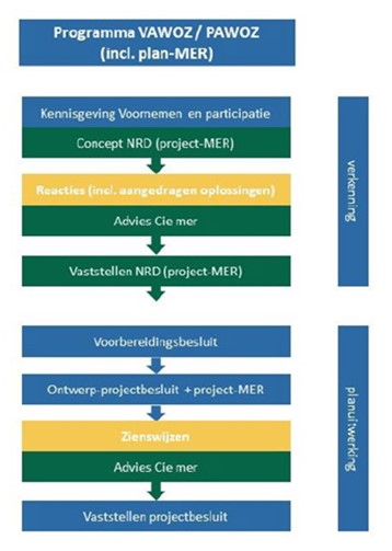 Zoals in hiervoor in paragraaf 6.1.3 is beschreven is er een verschil in de projectprocedures van DDW en TNW. Bij de projectprocedure voor DDW geldt dat de afwegingsfase is afgerond binnen PAWOZ-Eemshaven en daarom direct in de projectprocedure wordt overgegaan naar de project-mer. Voor Gasunie en TNW moet de afwegingsfase nog plaatsvinden en dit gebeurt in de Verkenningsfase van de projectprocedure. Daarna wordt overgegaan naar de Planuitwerkingsfase (zie ook afbeelding 21).