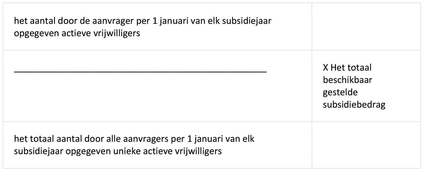In het geval dat een specifieke actieve vrijwilliger bij meerdere vrijwilligersorganisaties in hun subsidieaanvraag voor komt (vanaf hier; dubbelingen), wordt het subsidiebedrag voor deze vrijwilliger naar rato verdeeld over de vrijwilligersorganisaties die deze vrijwilliger opgeven in hun subsidieaanvraag.