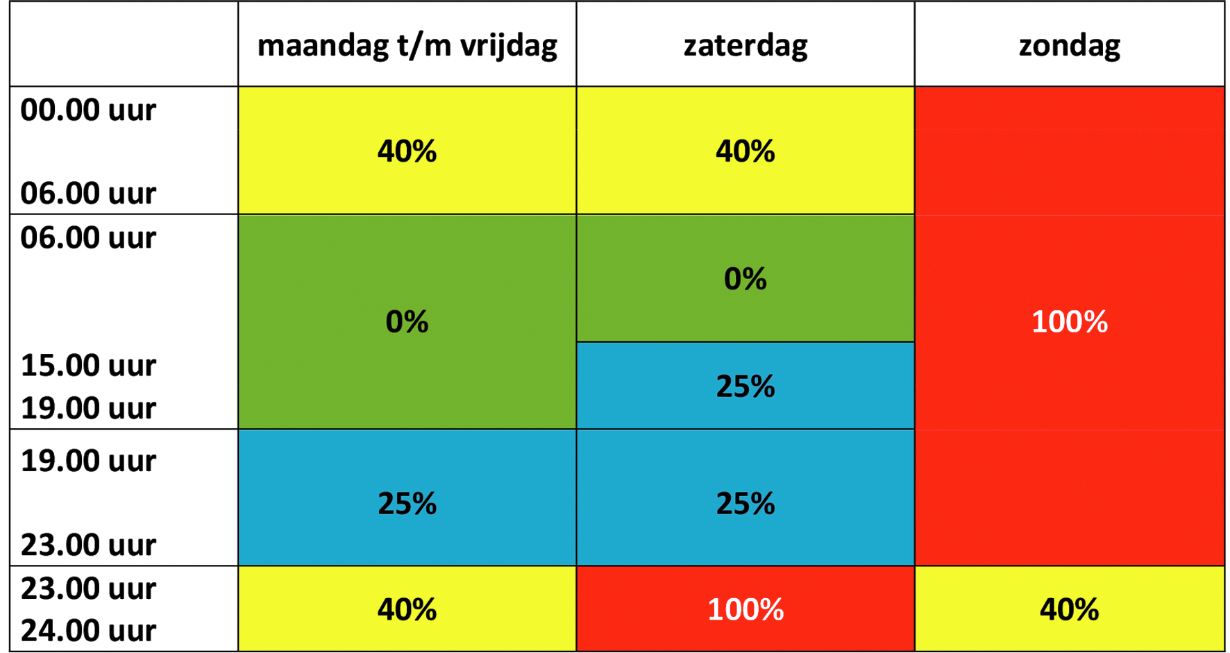 Mochten de bedrijfsomstandigheden het noodzakelijk maken (bijvoorbeeld bij onvoorziene omstandigheden) waardoor er toch sprake is van overwerk dan geldt het volgende. Op basis van de cao zijn overuren, uren boven de 38 uur per week (bepaald op maandbasis). De uren tot 38 uur worden aldus aangemerkt als meeruren en vergoedt tegen 100%.
