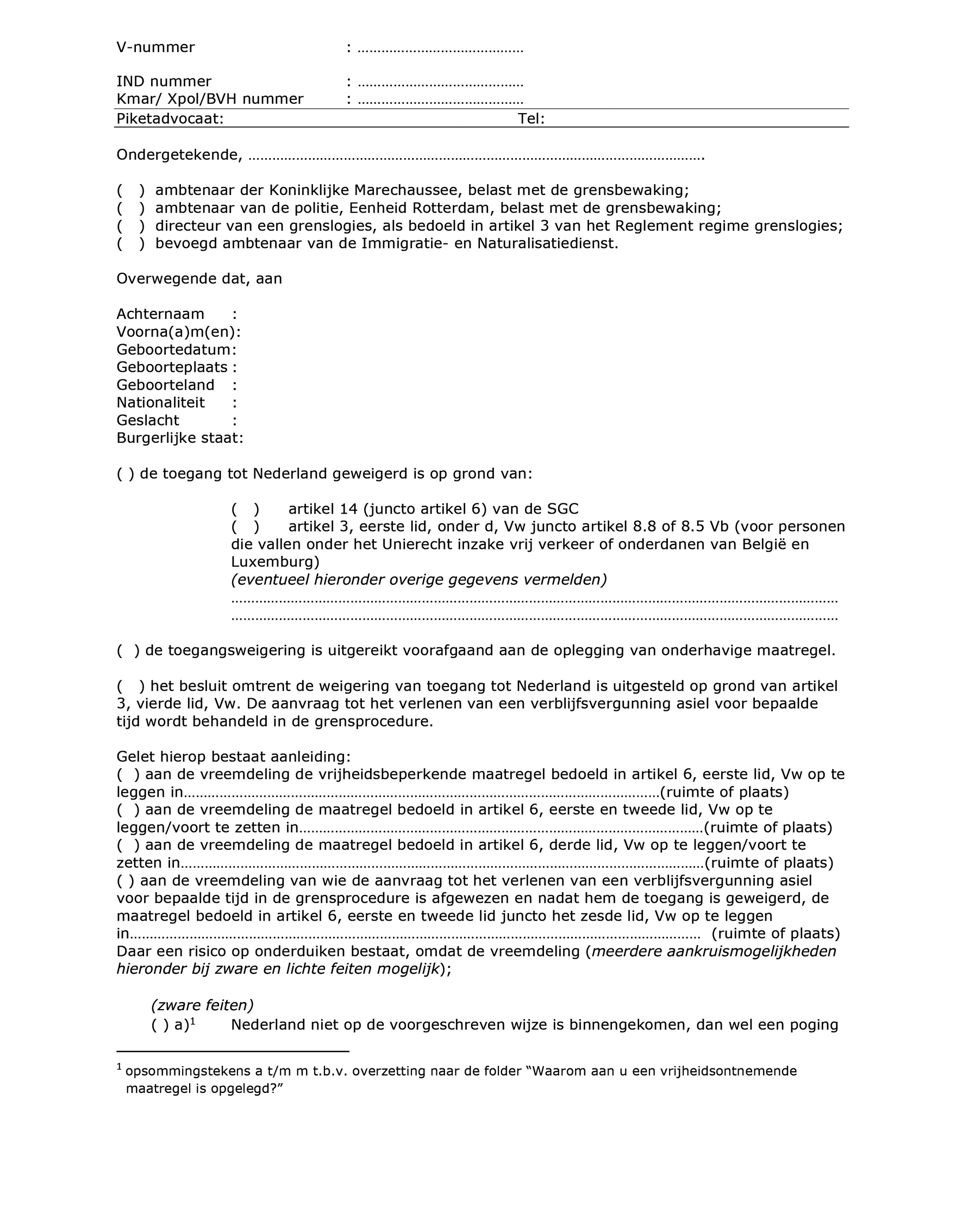 De ambtenaar belast met grensbewaking of met het toezicht op vreemdelingen doet direct schriftelijk gemotiveerd mededeling van de opgelegde beperking van de rechten van de vreemdeling aan alle volgende belanghebbenden: