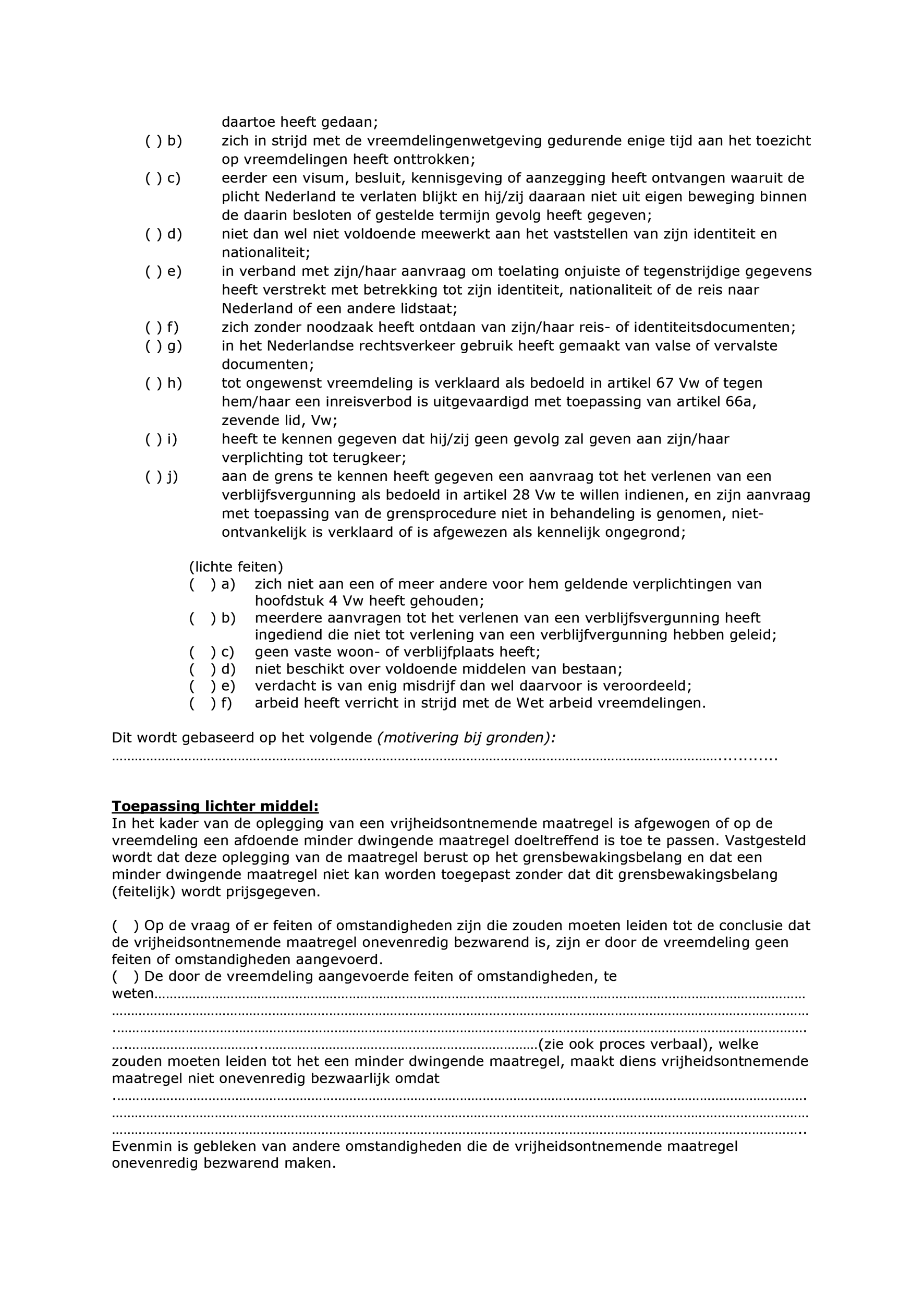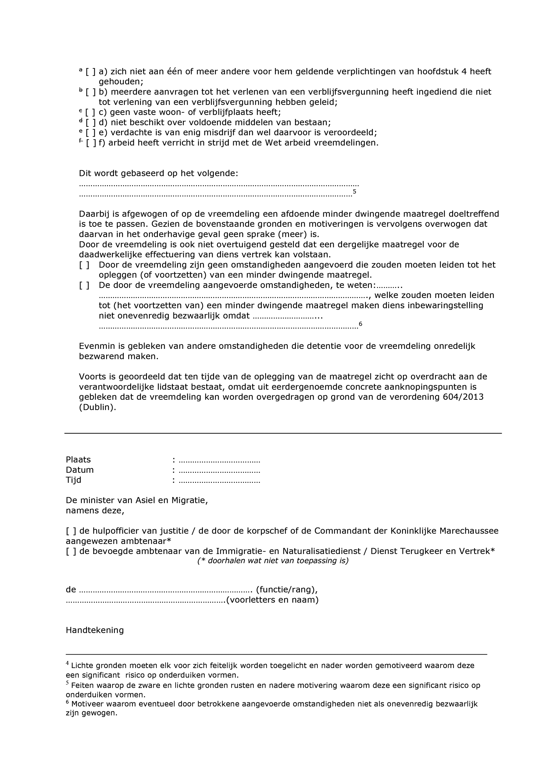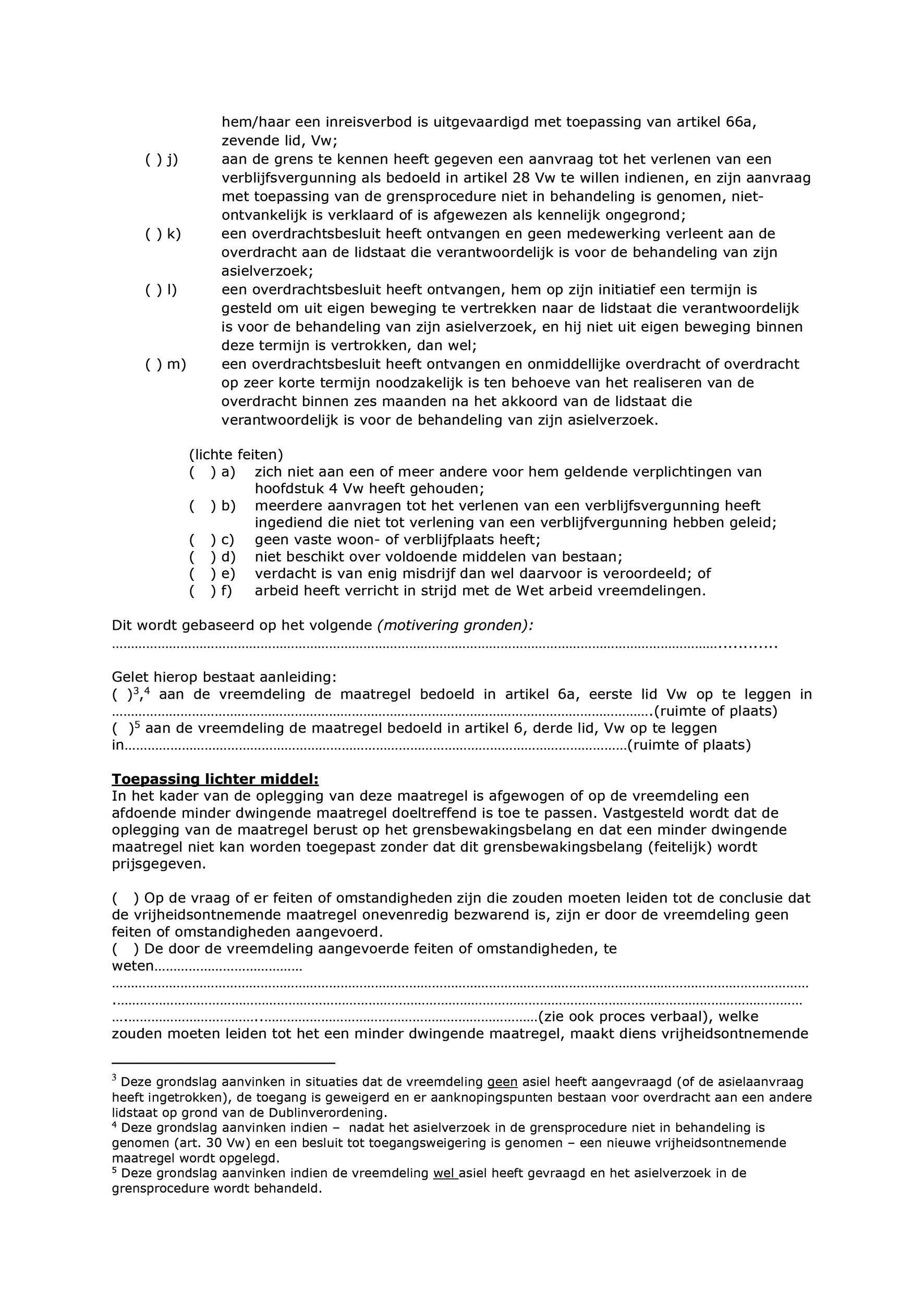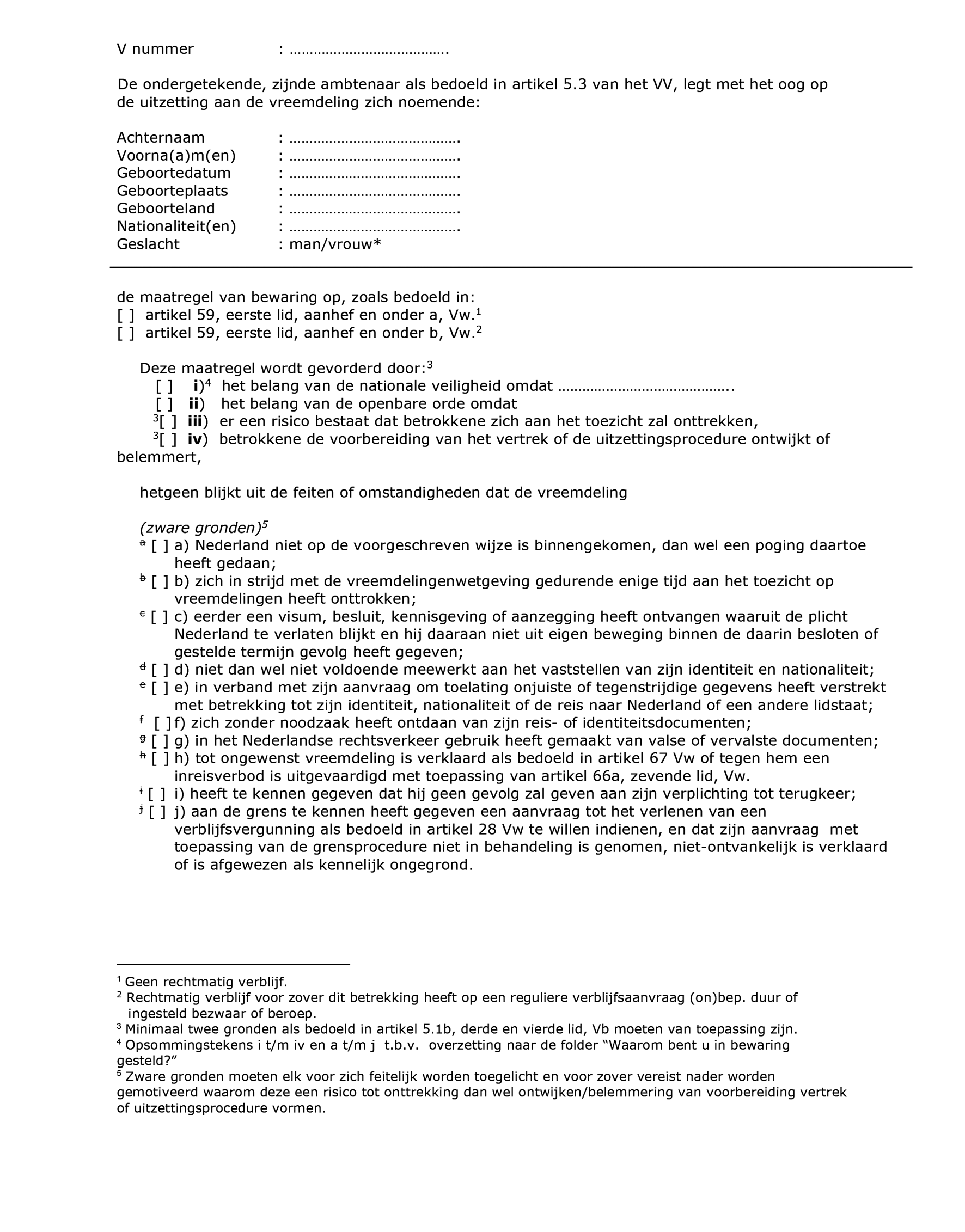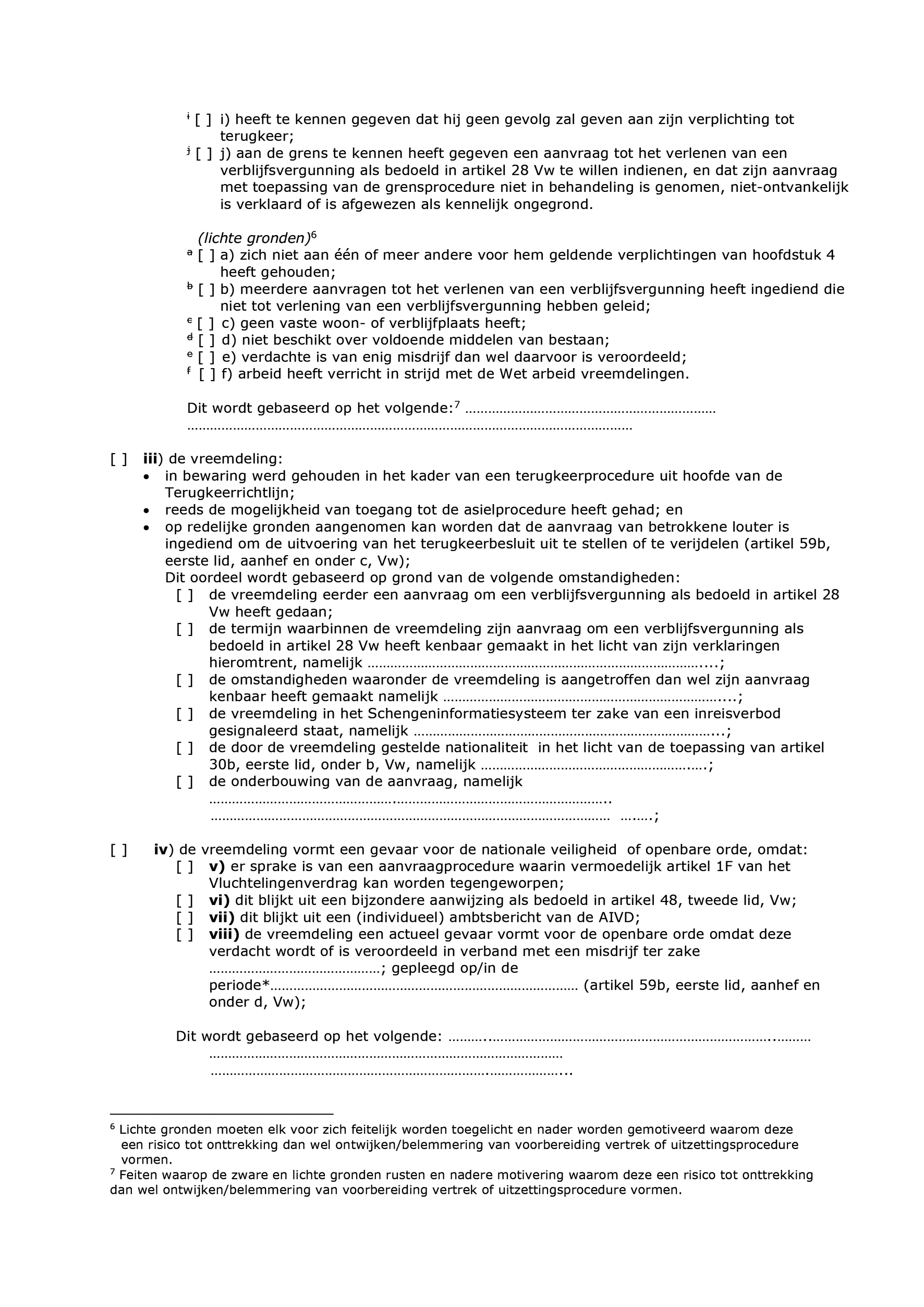 Ook is de volgorde van de gronden in lijn gebracht met de opbouw van artikel 5.1b, vierde lid, Vb. Zo zijn in zowel model M19 als M19-A de gronden ‘arbeid heeft verricht in strijd met de Wet arbeid vreemdelingen’ en ‘verdacht is van enig misdrijf dan wel daarvoor is veroordeeld’ overeenkomstig de volgorde van artikel 5.1b, vierde lid, Vb geplaatst.