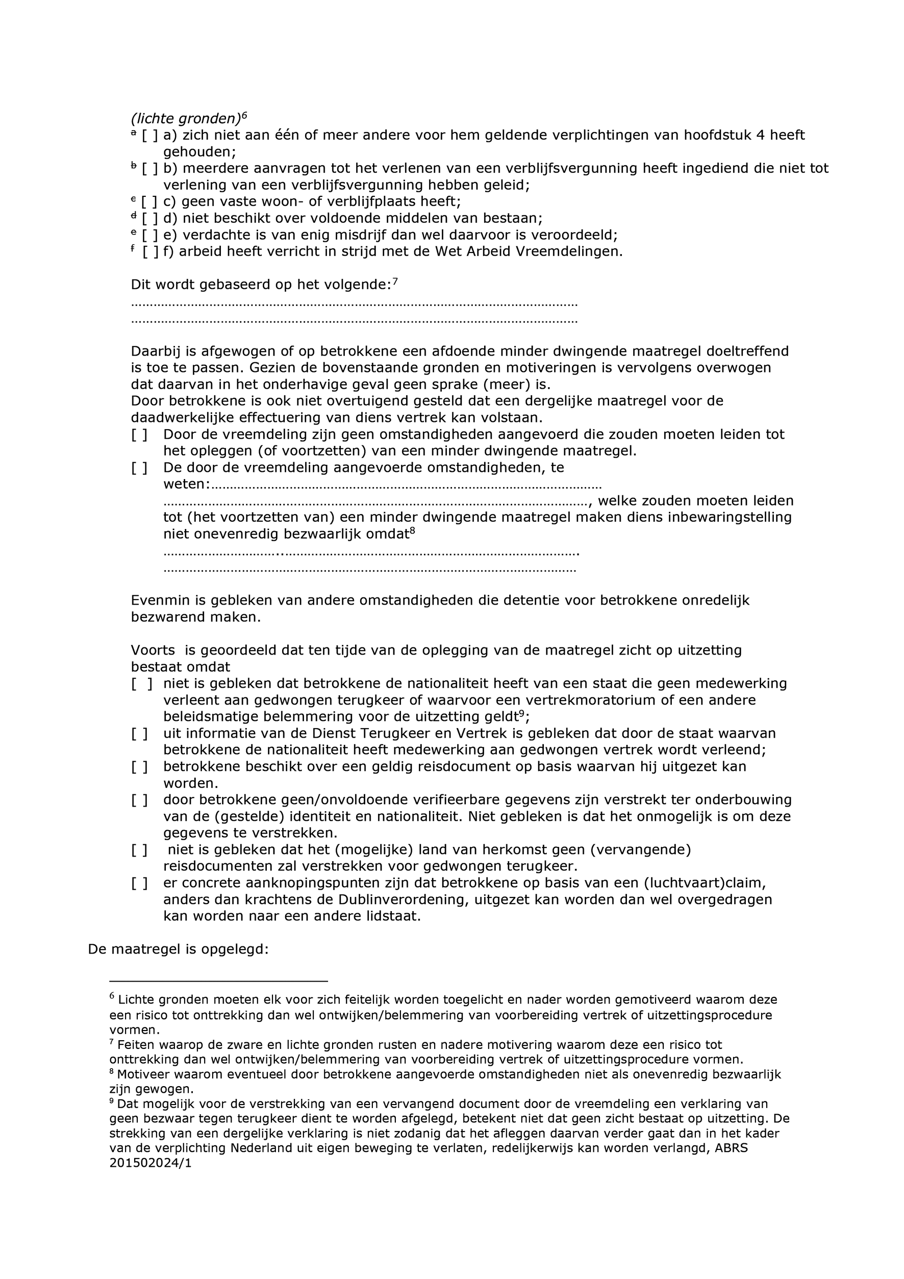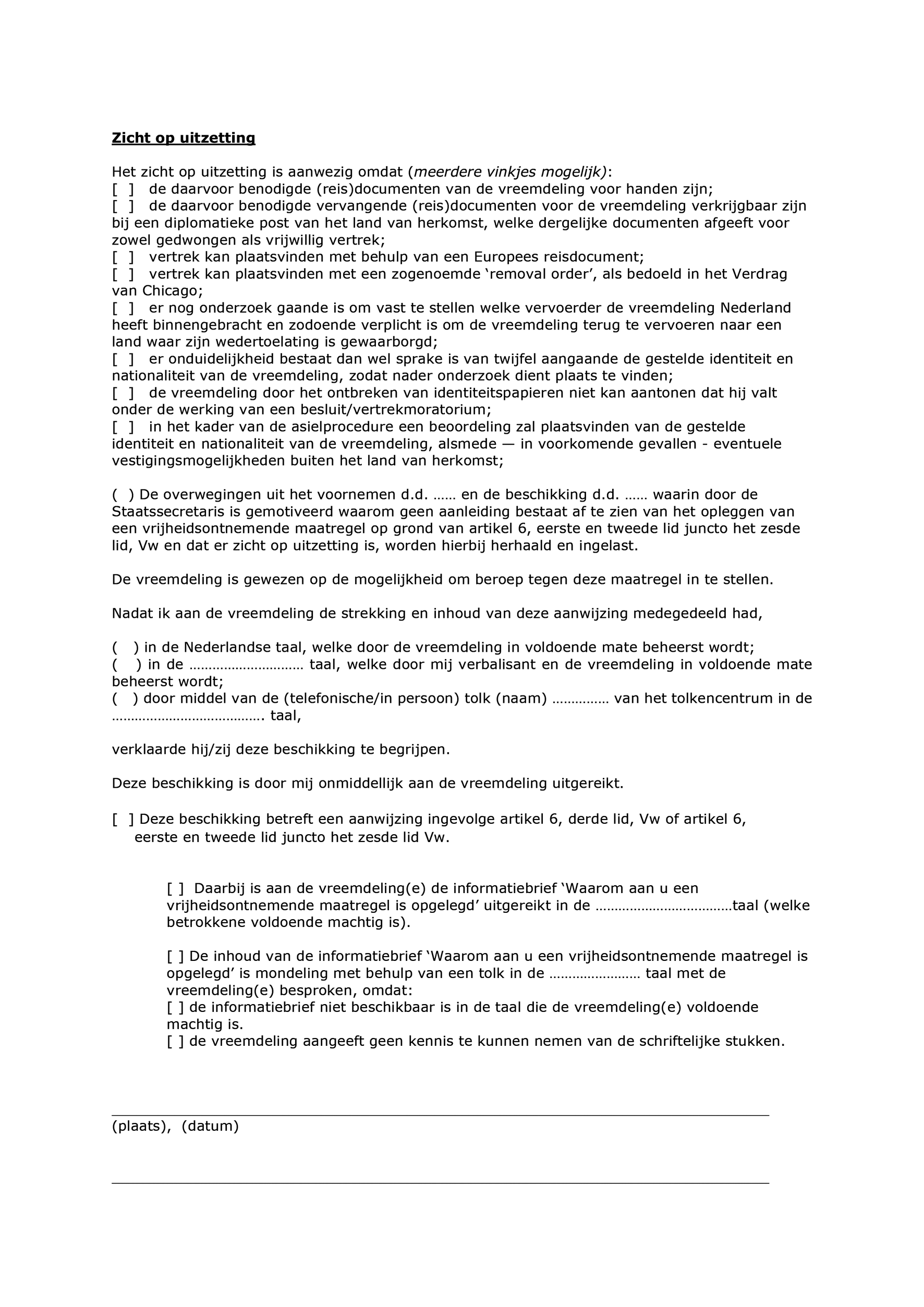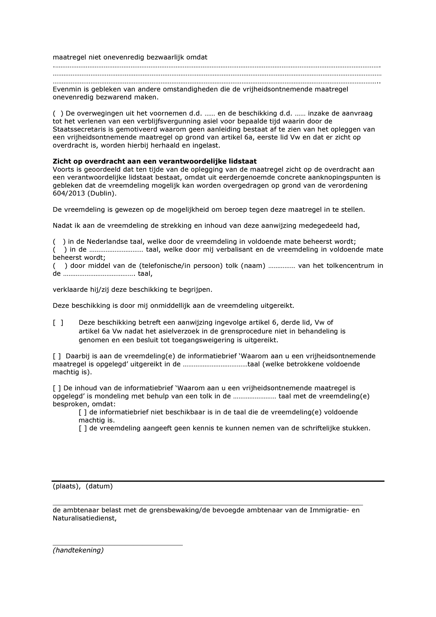 De verplichting dat de vreemdeling in een voor hem begrijpelijke taal uitgelegd wordt waarom zijn vrijheid wordt ontnomen bestaat op grond van artikel 5.3, tweede lid Vb ook in het geval van vrijheidsontneming op grond van artikel 6, derde lid Vw of artikel 6, zesde lid Vw plaats vindt. Om aan deze informatieplicht te voldoen zijn bij besluit van de Staatssecretaris van Justitie en Veiligheid van 21 maart 2024 de modelformulieren M19 en M19A aangepast en zijn er vier checkboxen over het formulier ‘Waarom aan u een vrijheidsontnemende maatregel is opgelegd’ toegevoegd.
