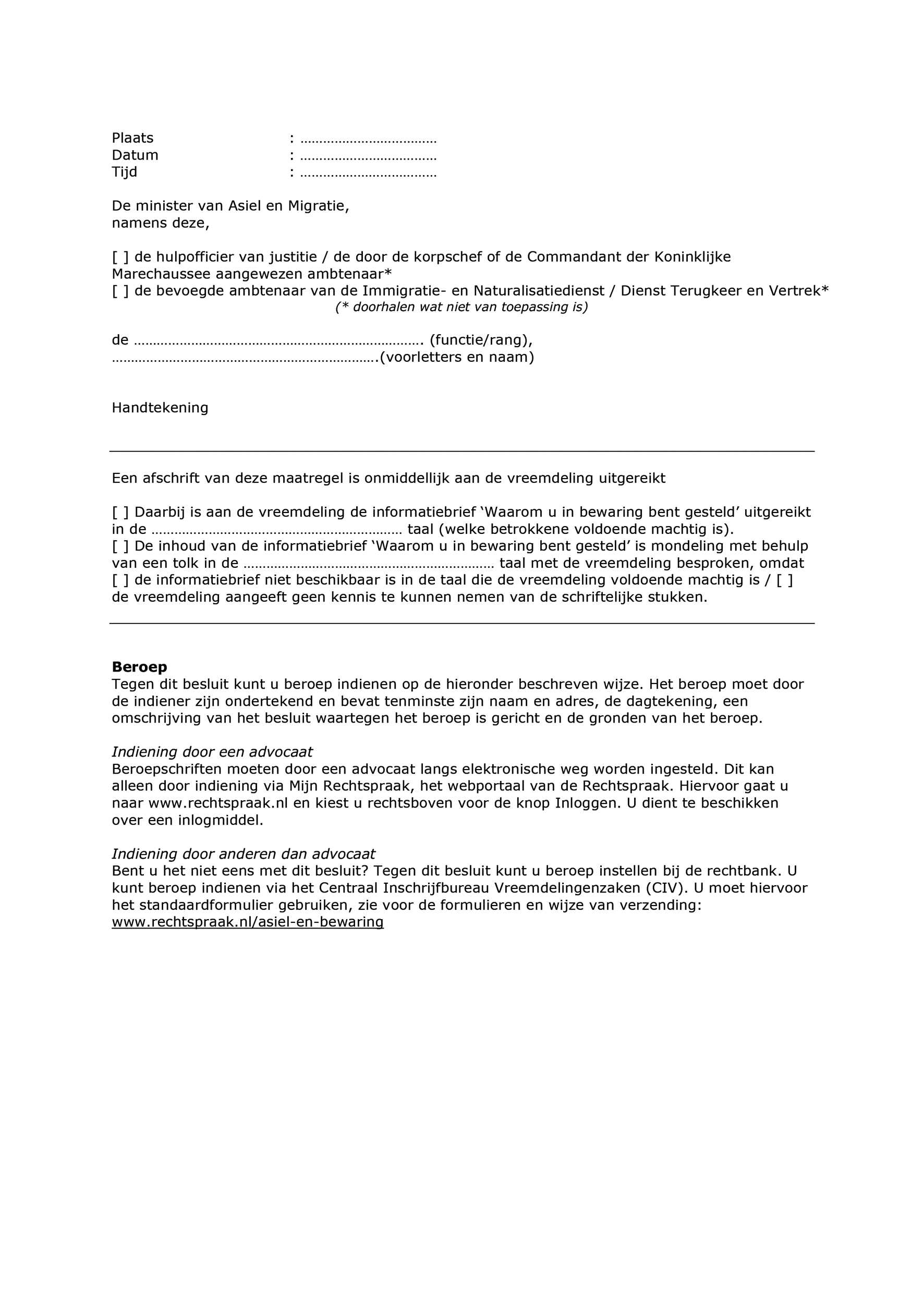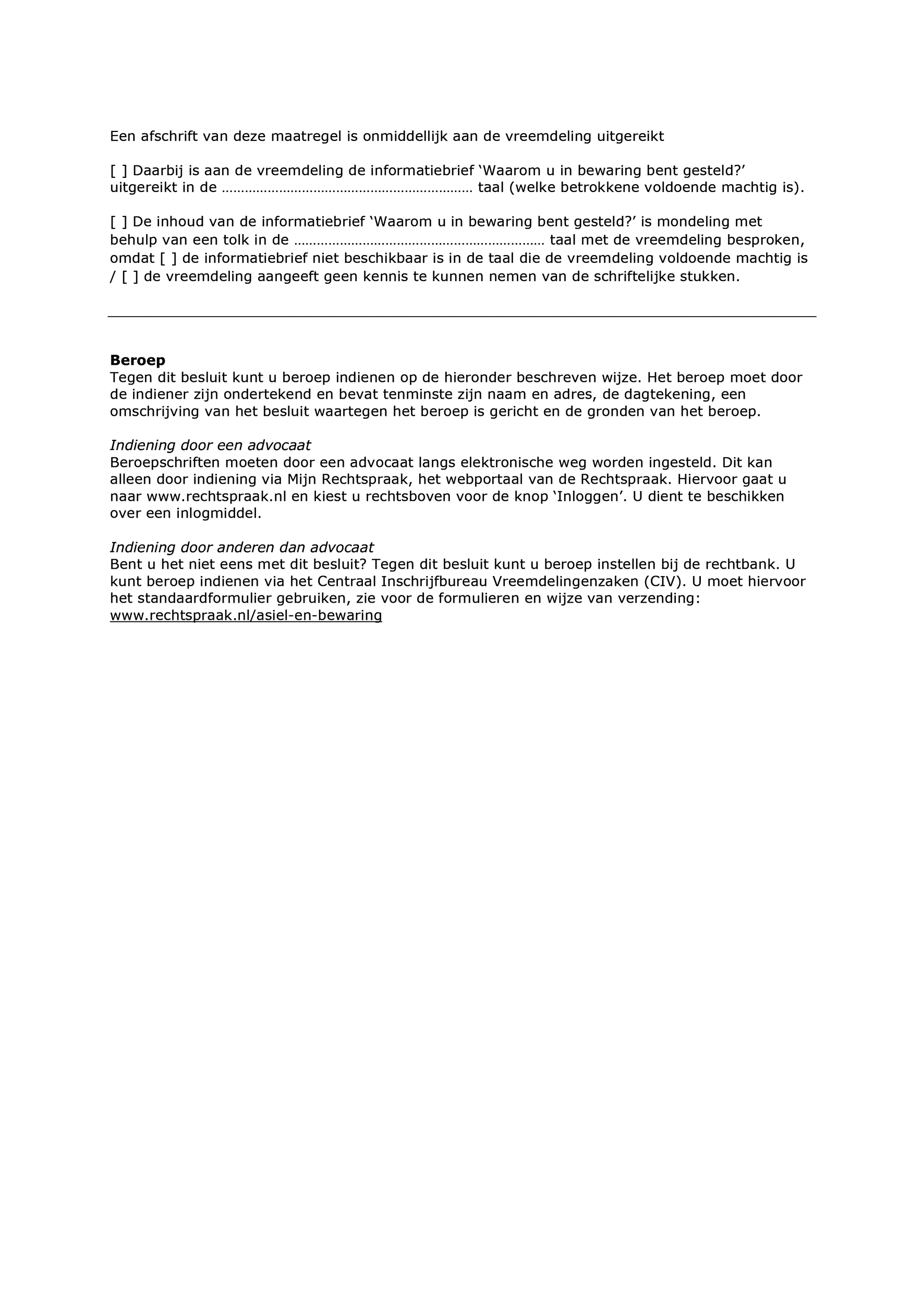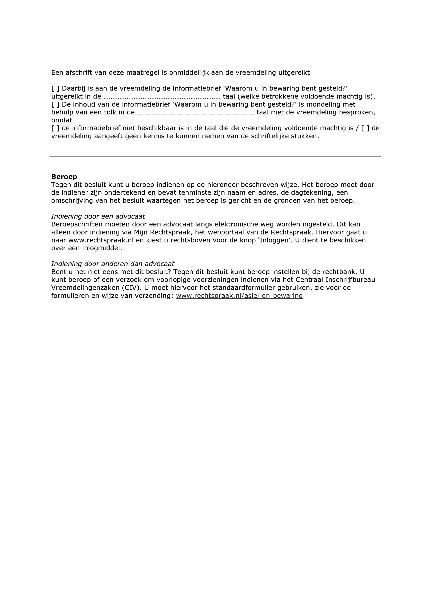 M109-B. Bij het opleggen van de maatregel wordt tevens de informatiefolder ‘Waarom bent u in bewaring gesteld?’ uitgereikt. Deze folder is opgesteld in een voor de vreemdeling begrijpelijke taal en wordt voorzien van een overzicht van de van toepassing zijnde feitelijke en juridische gronden.