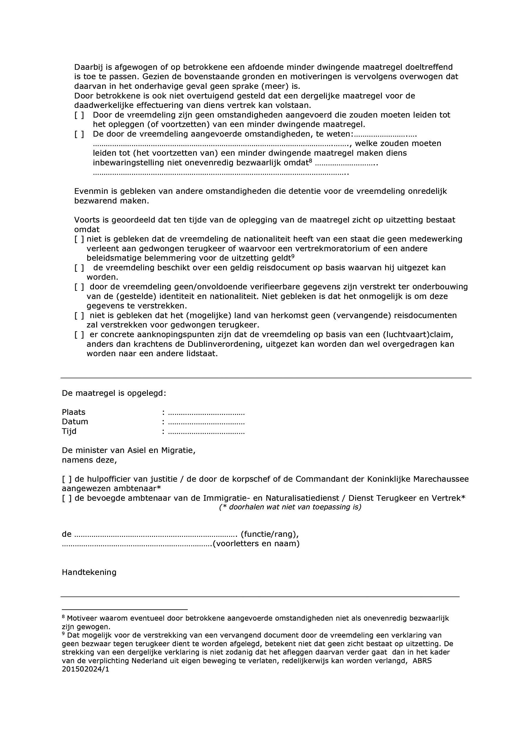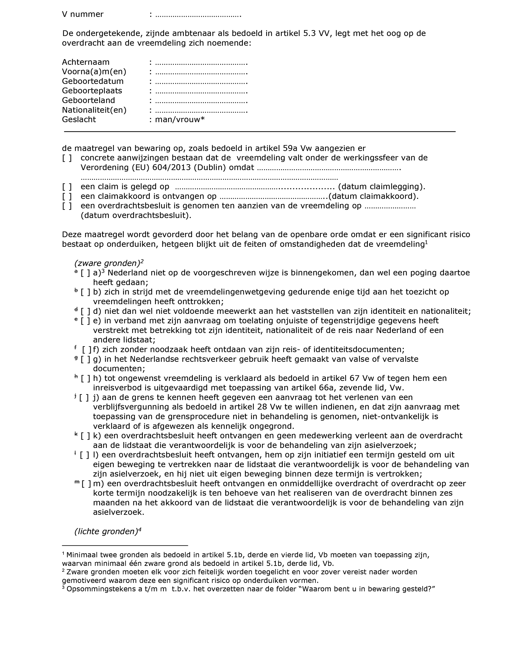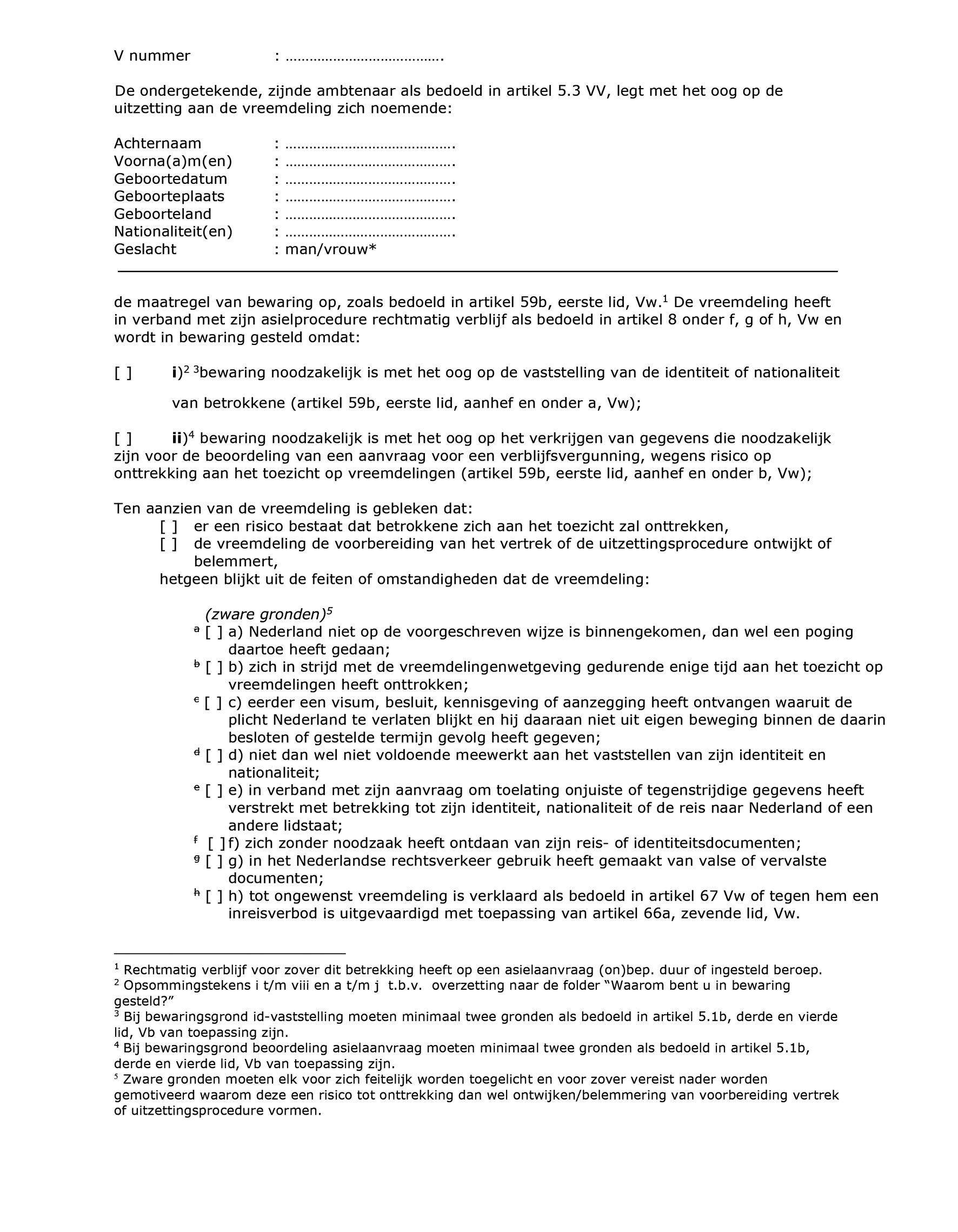 In de uitspraak van de Afdeling bestuursrechtspraak van de Raad van State (ABRvS) van 24 juli 2024 (ECLI:NL:RVS:2024:2979) is geoordeeld dat de minister de werkwijze ten aanzien van de informatieplicht uit artikel 5.3, eerste lid, derde zin, van het Vb 2000 nog niet volledig nakomt. Voor het nakomen van deze verplichting is een nieuwe informatiefolder ‘Waarom bent u in bewaring gesteld?’ ontwikkeld die in tegenstelling tot de eerdere versie onder andere voorziet in een overzicht van de van toepassing zijnde feitelijke en juridische gronden in een voor de vreemdeling begrijpelijke taal. Dit is aangepast in paragraaf A5/6.6 Vc. Voor het aankruisen van de gronden op de informatiefolder zijn in de M109, M109-A en M109-B opsommingstekens ingevoegd.