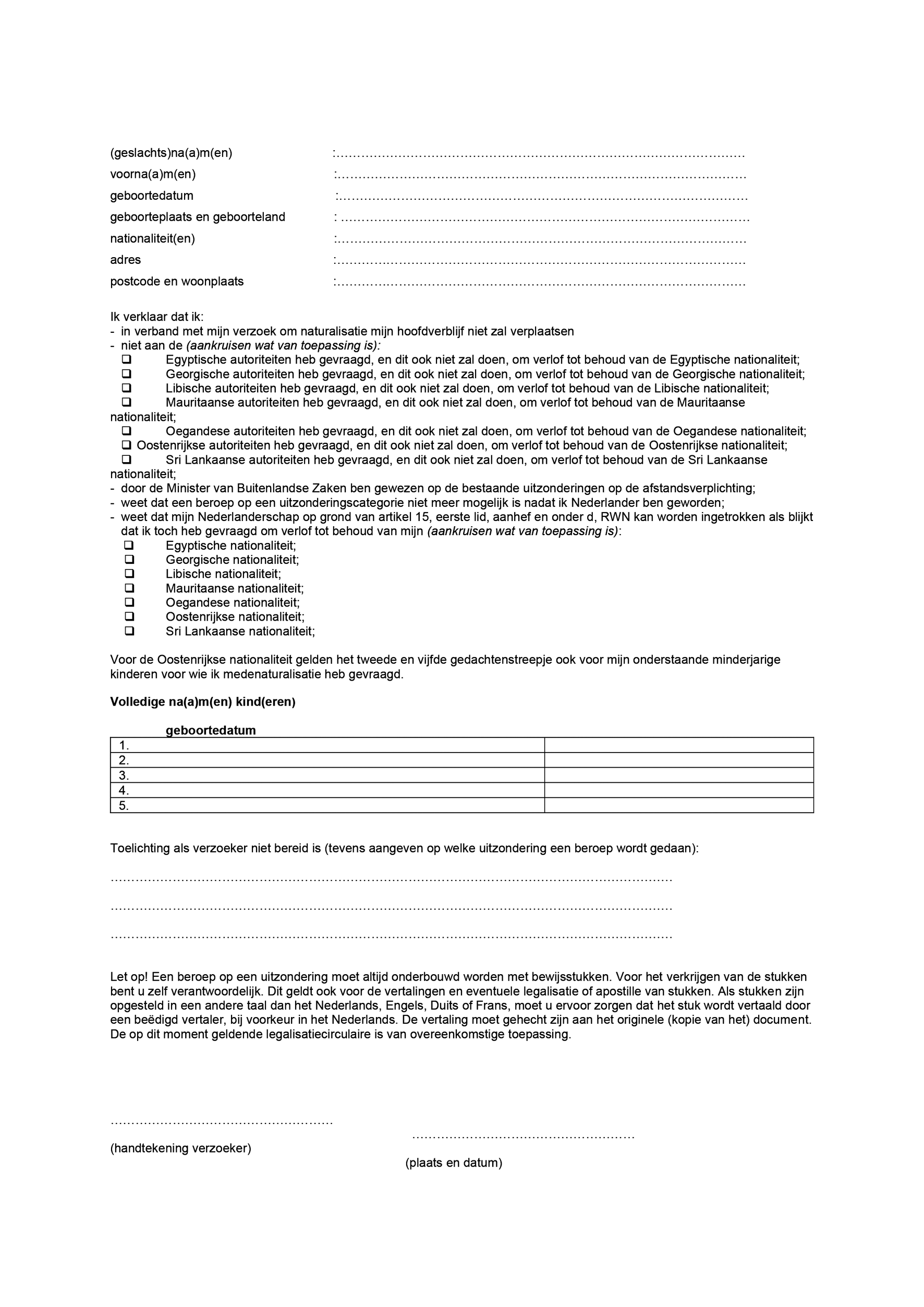 Ten aanzien van de afstandsverplichting informeert de Minister van Buitenlandse Zaken – voor zover mogelijk – de verzoeker of hij al dan niet behoort tot een uitzonderingscategorie dan wel of redelijkerwijs van hem kan worden verlangd dat hij afstand doet van zijn oorspronkelijke nationaliteit. Indien geen van de uitzonderingen van toepassing is, dient de verzoeker een verklaring te ondertekenen dat hij bereid is het mogelijke te zullen doen om bij of na de totstandkoming van de naturalisatie zijn oorspronkelijke nationaliteit(en) te verliezen (artikel 32 BVVN). De bereidheidsverklaring is opgenomen als model 2.4a HRWN (bereidheidsverklaring tot afstand oorspronkelijke nationaliteit) respectievelijk model 2.5a HRWN (verklaring in verband met verlies van de Egyptische/Oostenrijkse/Georgische/Libische/Mauritaanse/ Oegandese/Sri Lankaanse nationaliteit). Zie voor de afstandsverplichting verder de toelichting bij artikel 9, eerste lid, onder b, RWN.