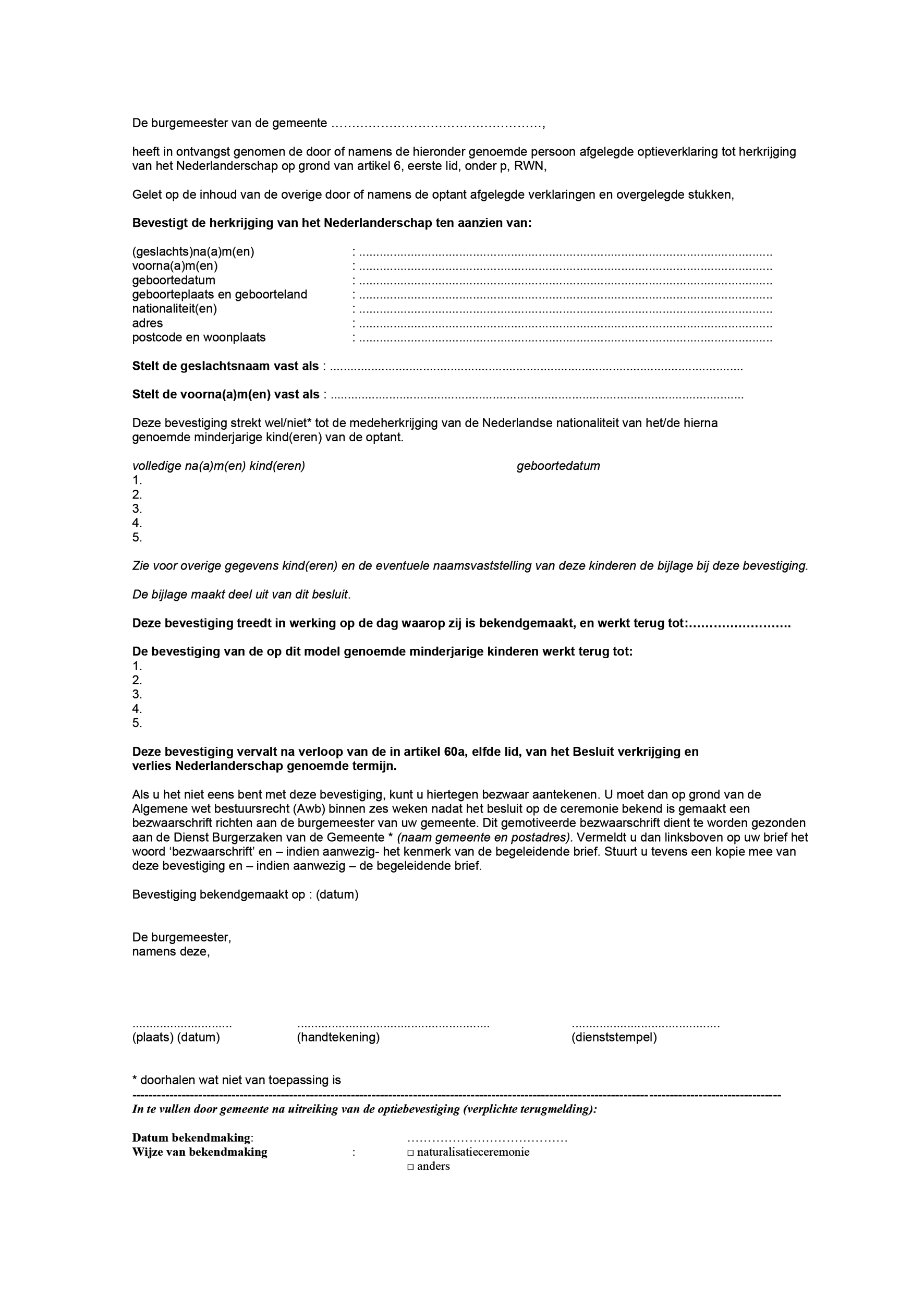 Model 1.54 HRWN: Bevestiging van de herkrijging van het Nederlanderschap door optie op grond van artikel 6, eerste lid, onder p, RWN