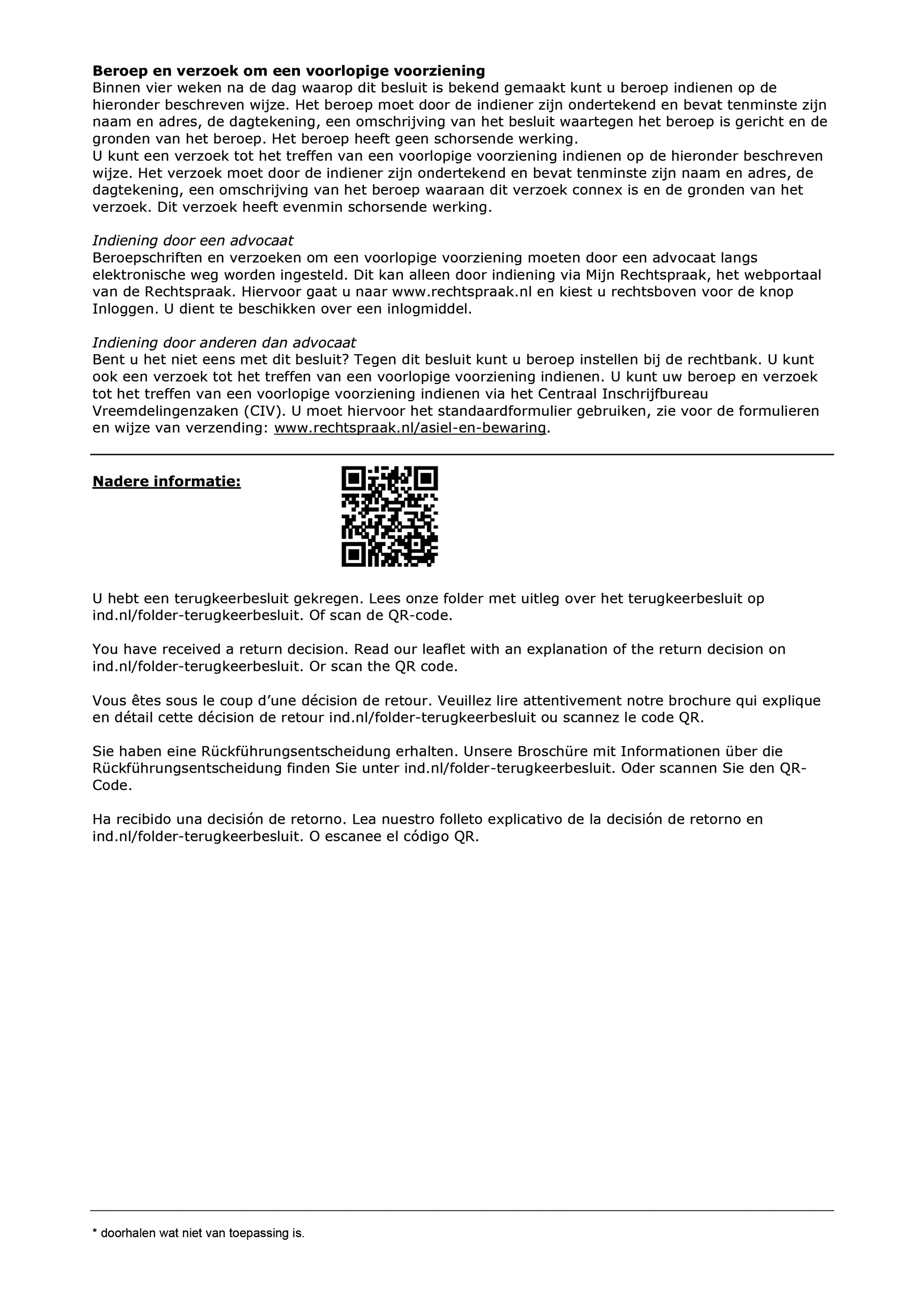 • als artikel 64 Vw voor de duur van minder dan zes weken wordt toegepast, krijgt de vreemdeling een brief van de IND waarin staat voor hoe lang het uitstel van vertrek op grond van artikel 64 Vw geldt;