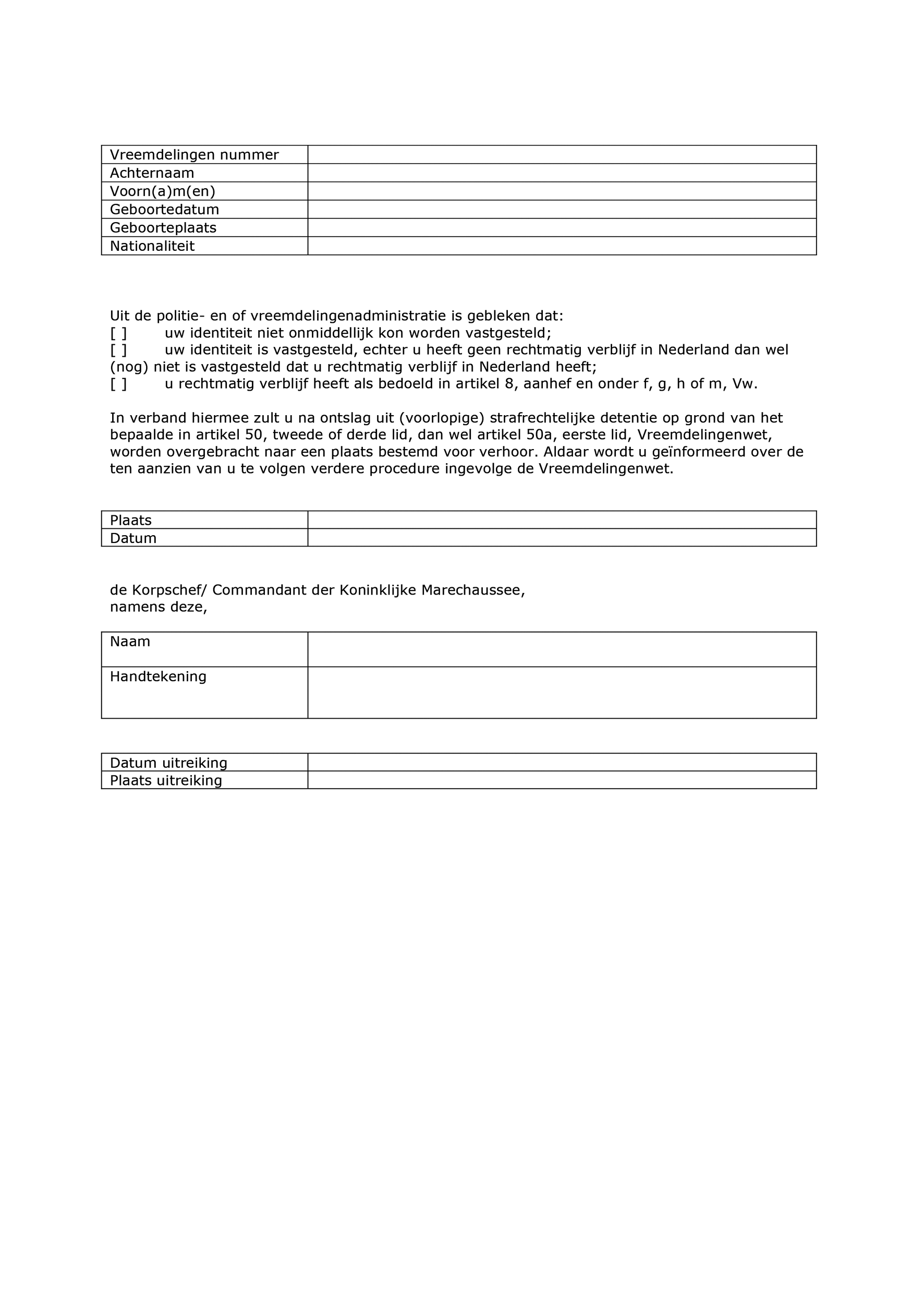 Model M 122: Mededeling toepassing artikel 50, tweede of derde lid, dan wel artikel 50a, eerste lid, Vreemdelingenwet