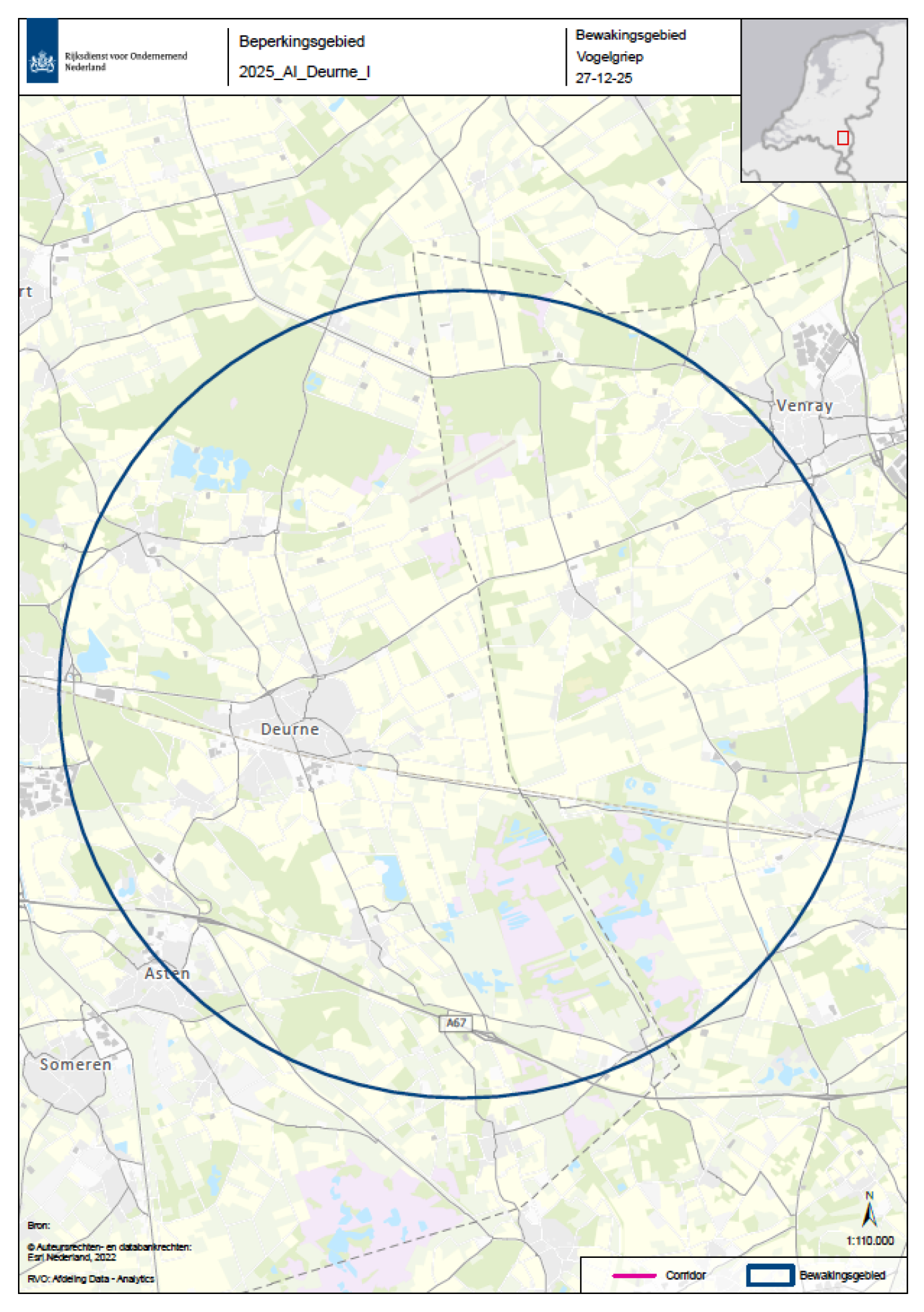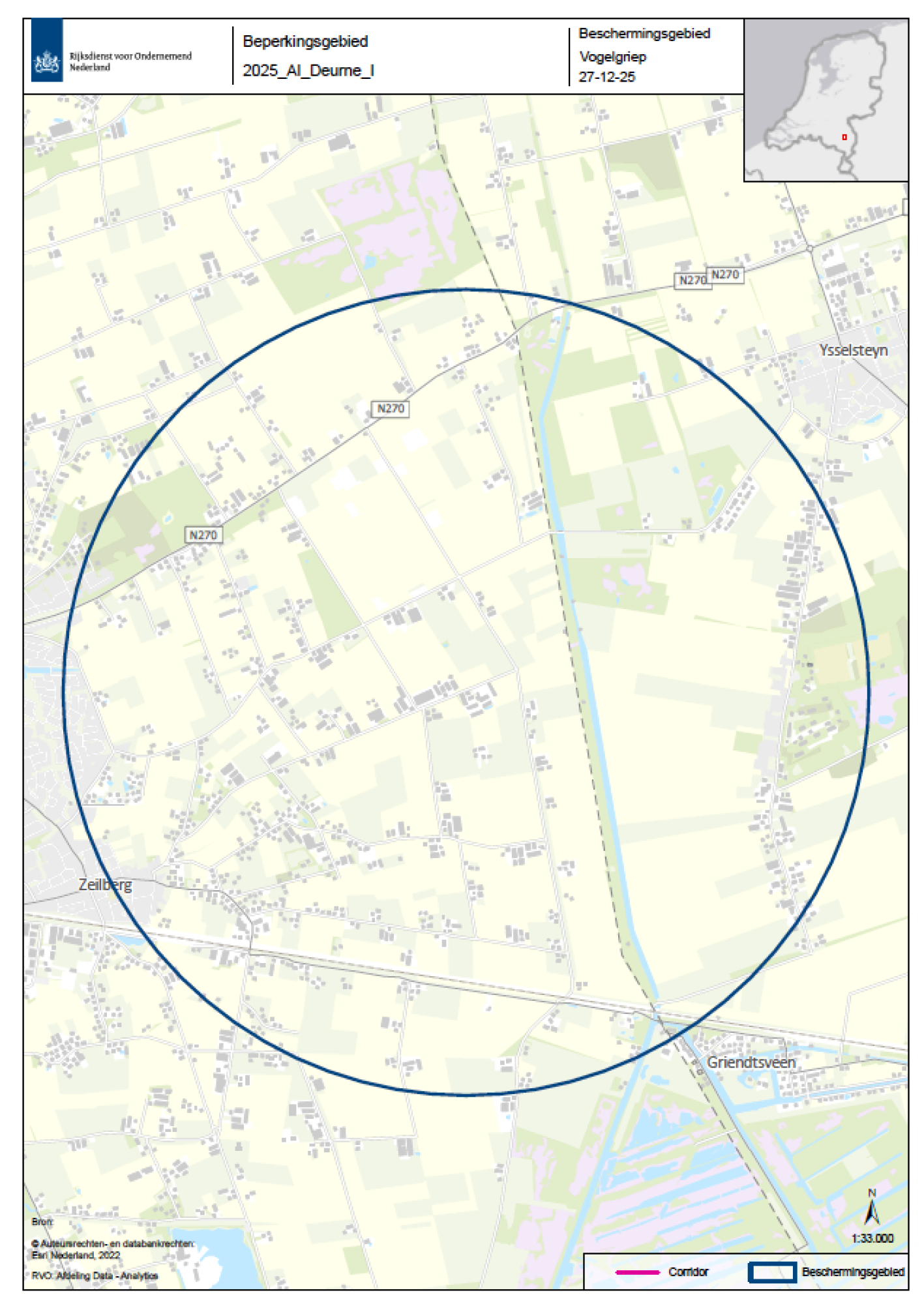 De beschermingszone en bewakingszone zijn respectievelijk het gebied met een straal van 3 en 10 kilometer rond de besmette inrichting, zoals aan de hand van een plattegrond is aangeduid in bijlage 1. Een inzoombare, gedetailleerde kaart van die zone is beschikbaar op de website van de Rijksdienst voor Ondernemend Nederland (RVO) (GeoWeb).