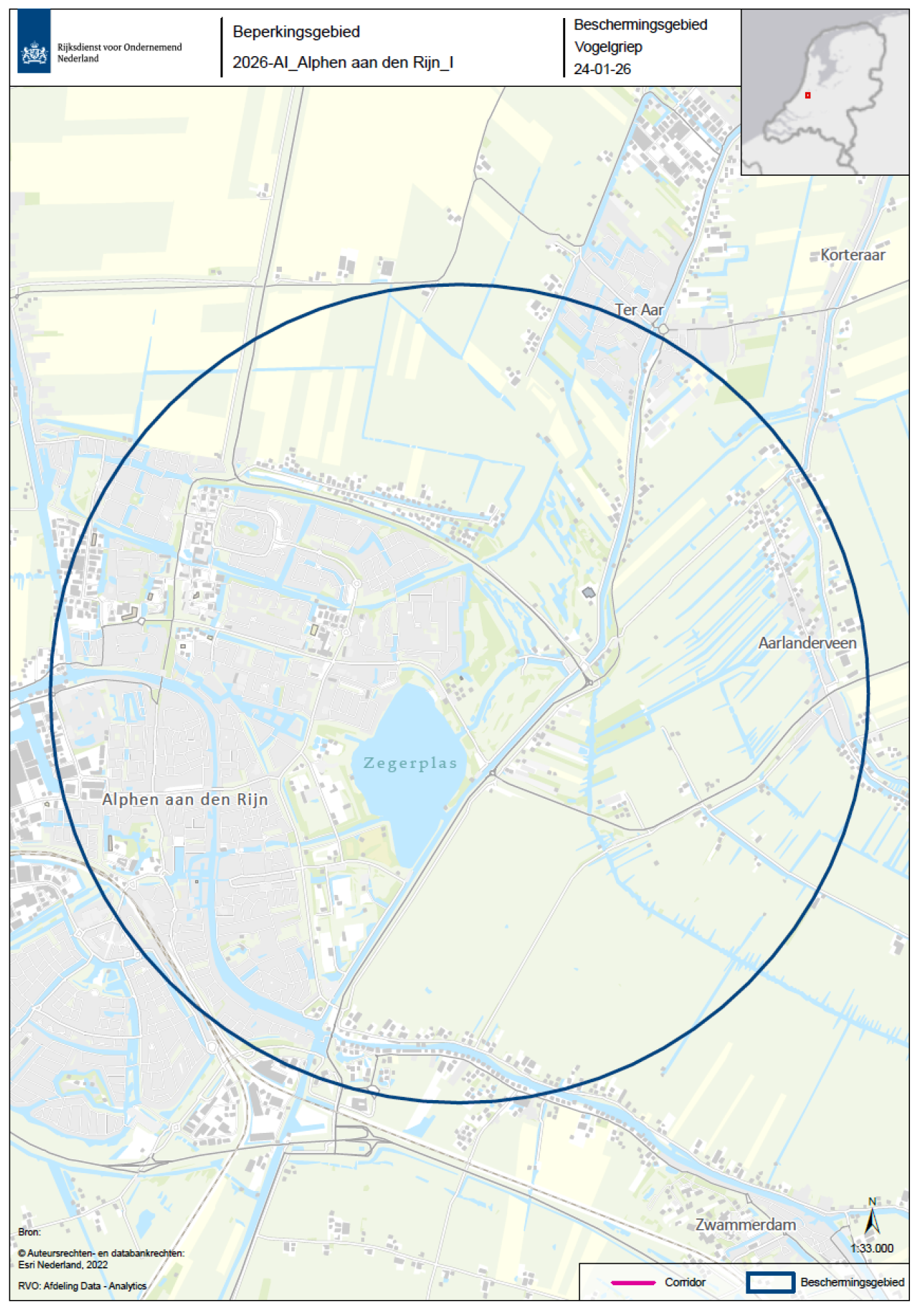 De beschermingszone en bewakingszone zijn respectievelijk het gebied met een straal van 3 en 10 kilometer rond de besmette inrichting, zoals aan de hand van een plattegrond is aangeduid in bijlage 1. Een inzoombare, gedetailleerde kaart van die zone is beschikbaar op de website van de Rijksdienst voor Ondernemend Nederland (RVO) (GeoWeb).