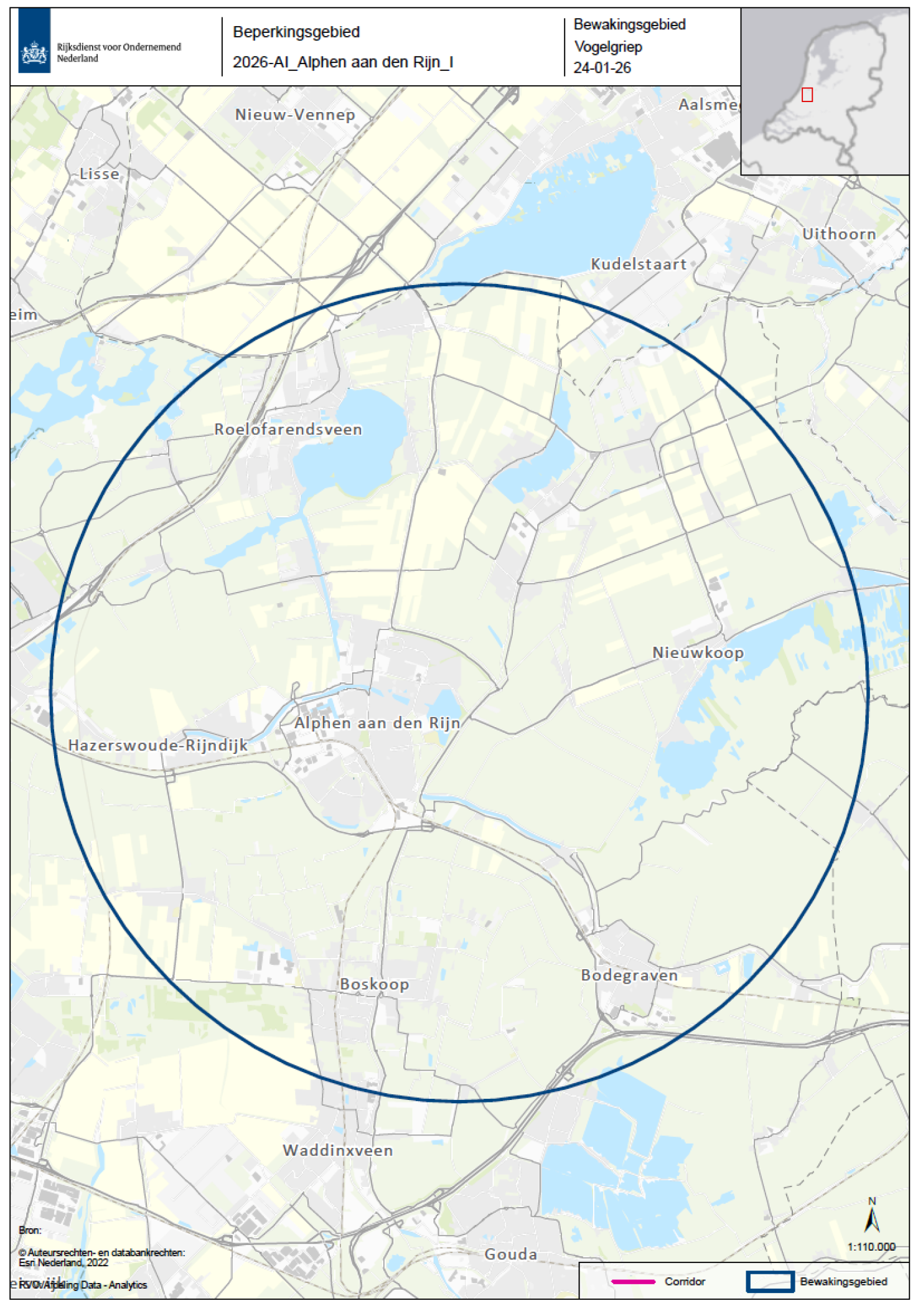 Op een inrichting in Alphen aan den Rijn in de provincie Zuid-Holland is een uitbraak geconstateerd van aviaire influenza, waarschijnlijk hoogpathogene aviaire influenza (HPAI), ofwel vogelgriep. HPAI is een besmettelijke dierziekte, die tot hoge sterftecijfers kan leiden bij vogels en kan worden overgedragen op mensen (een zogenoemde zoönose). Het isoleren van de gevonden besmettingshaard en het voorkomen van verdere verspreiding van de ziekte is daarom van het grootste belang.