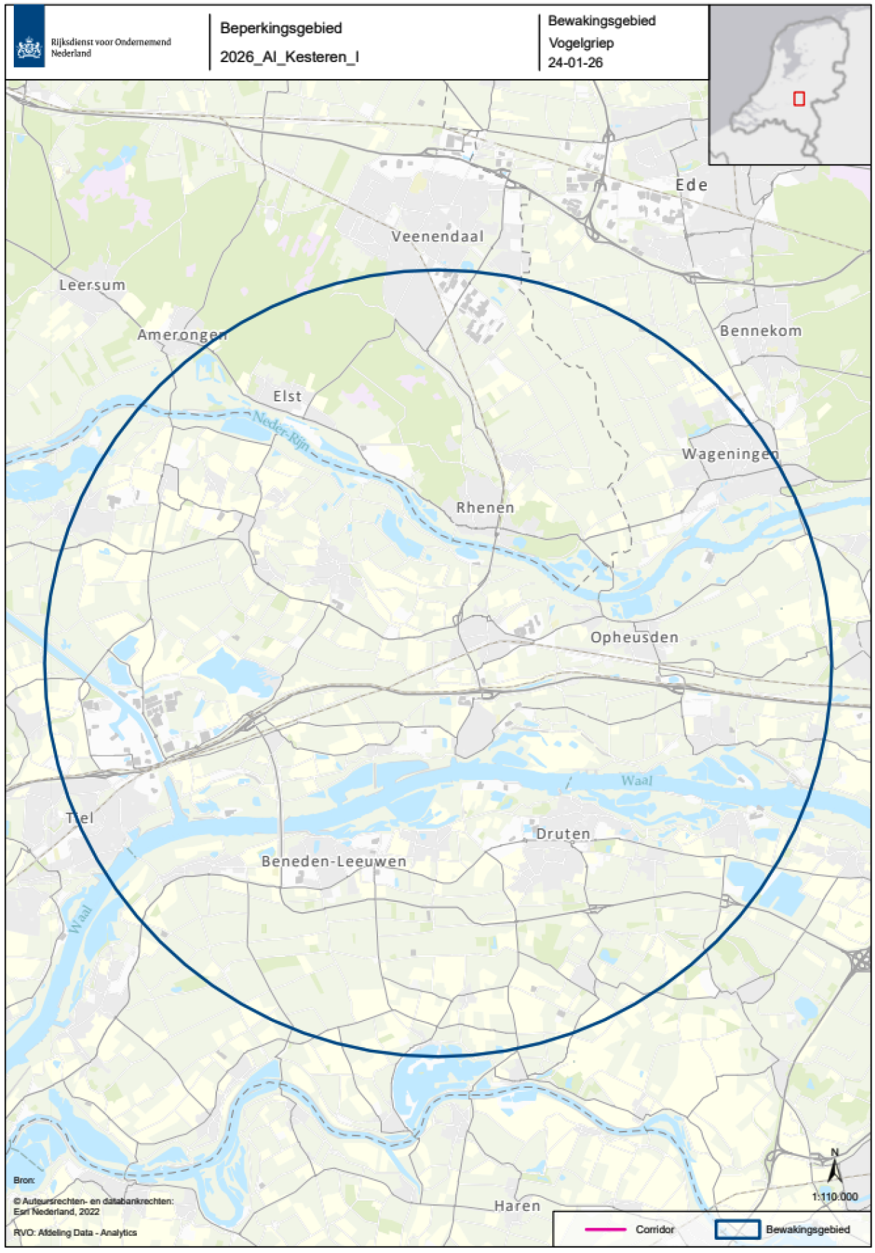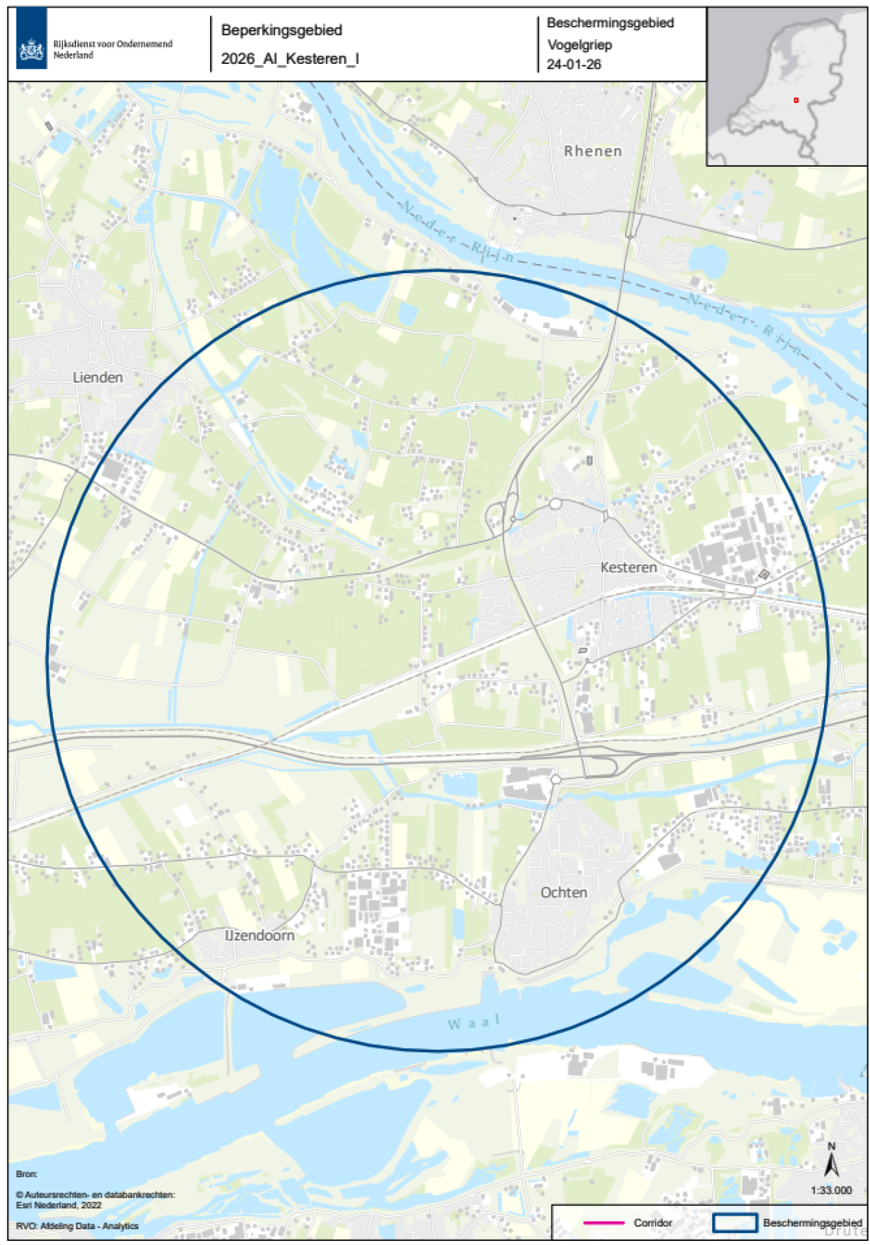 De beschermingszone en bewakingszone zijn respectievelijk het gebied met een straal van 3 en 10 kilometer rond de besmette inrichting, zoals aan de hand van een plattegrond is aangeduid in bijlage 1. Een inzoombare, gedetailleerde kaart van die zone is beschikbaar op de website van de Rijksdienst voor Ondernemend Nederland (RVO) (GeoWeb).