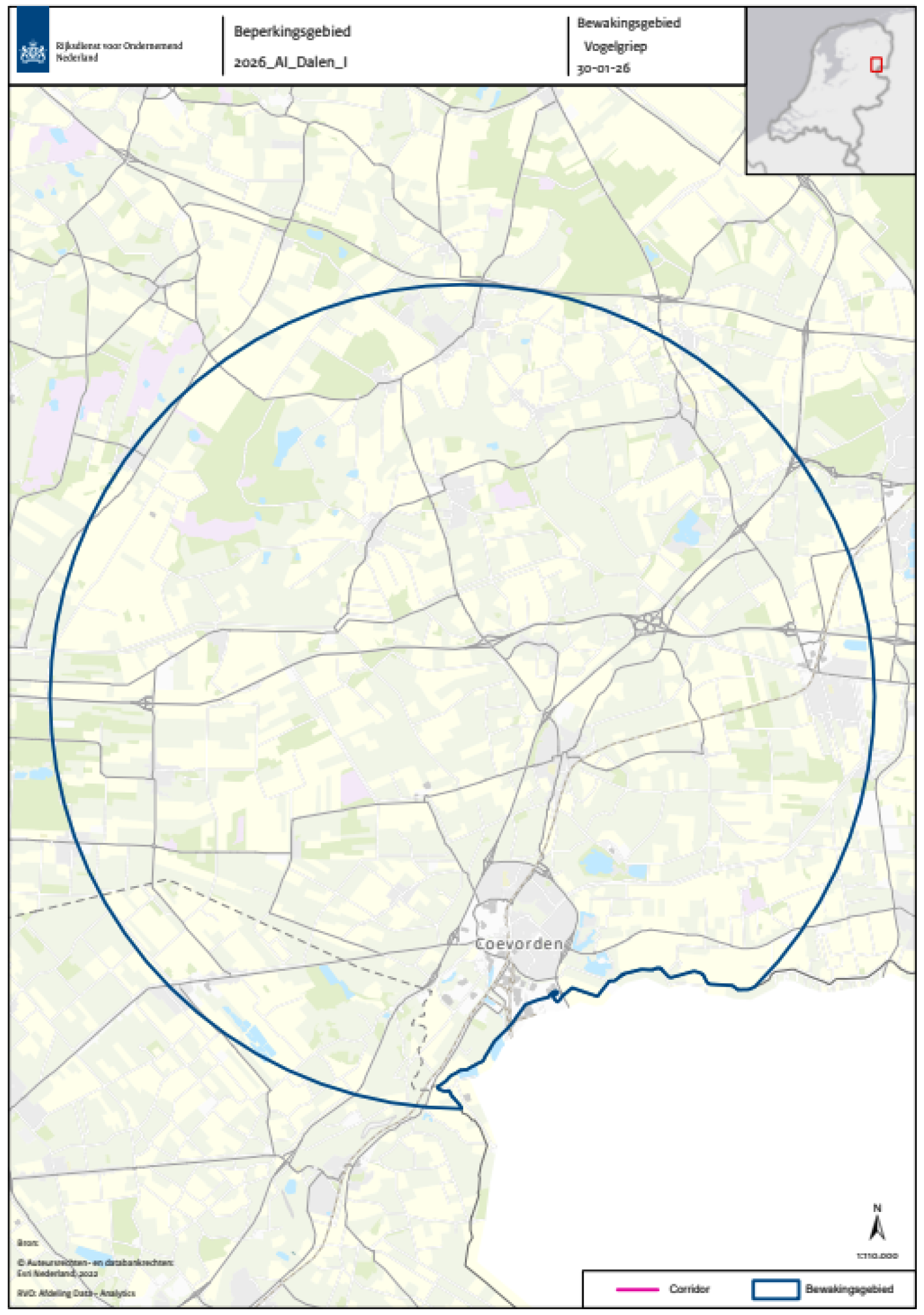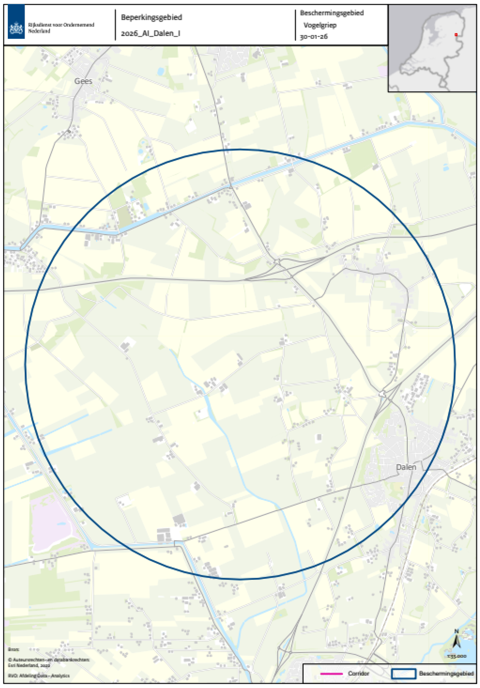 De beschermingszone en bewakingszone zijn respectievelijk het gebied met een straal van 3 en 10 kilometer rond de besmette inrichting, zoals aan de hand van een plattegrond is aangeduid in bijlage 1. Een inzoombare, gedetailleerde kaart van die zone is beschikbaar op de website van de Rijksdienst voor Ondernemend Nederland (RVO) (GeoWeb).