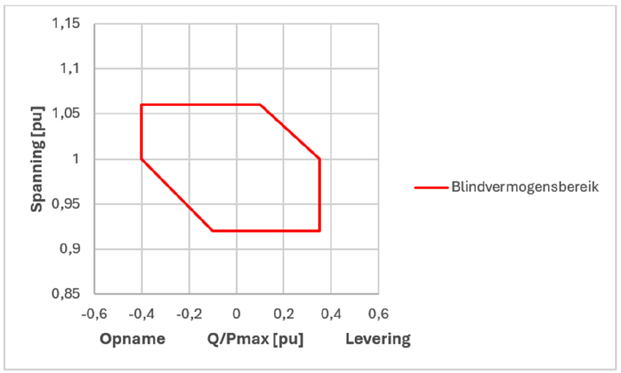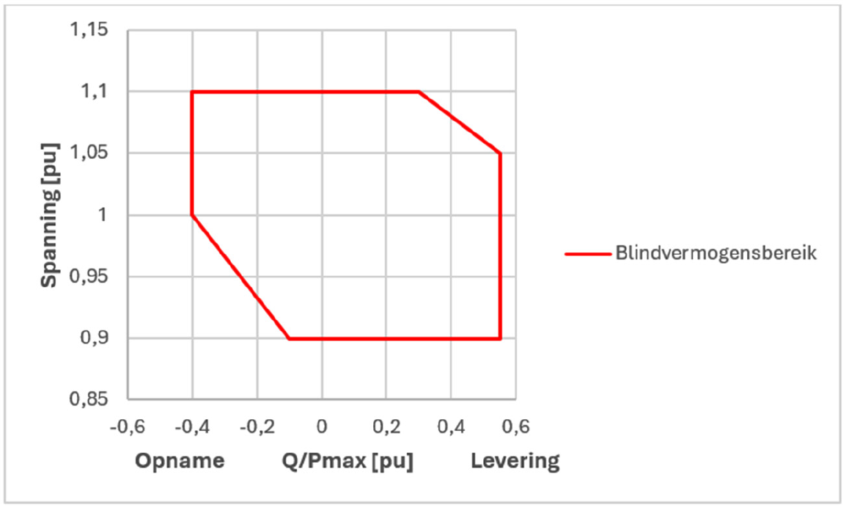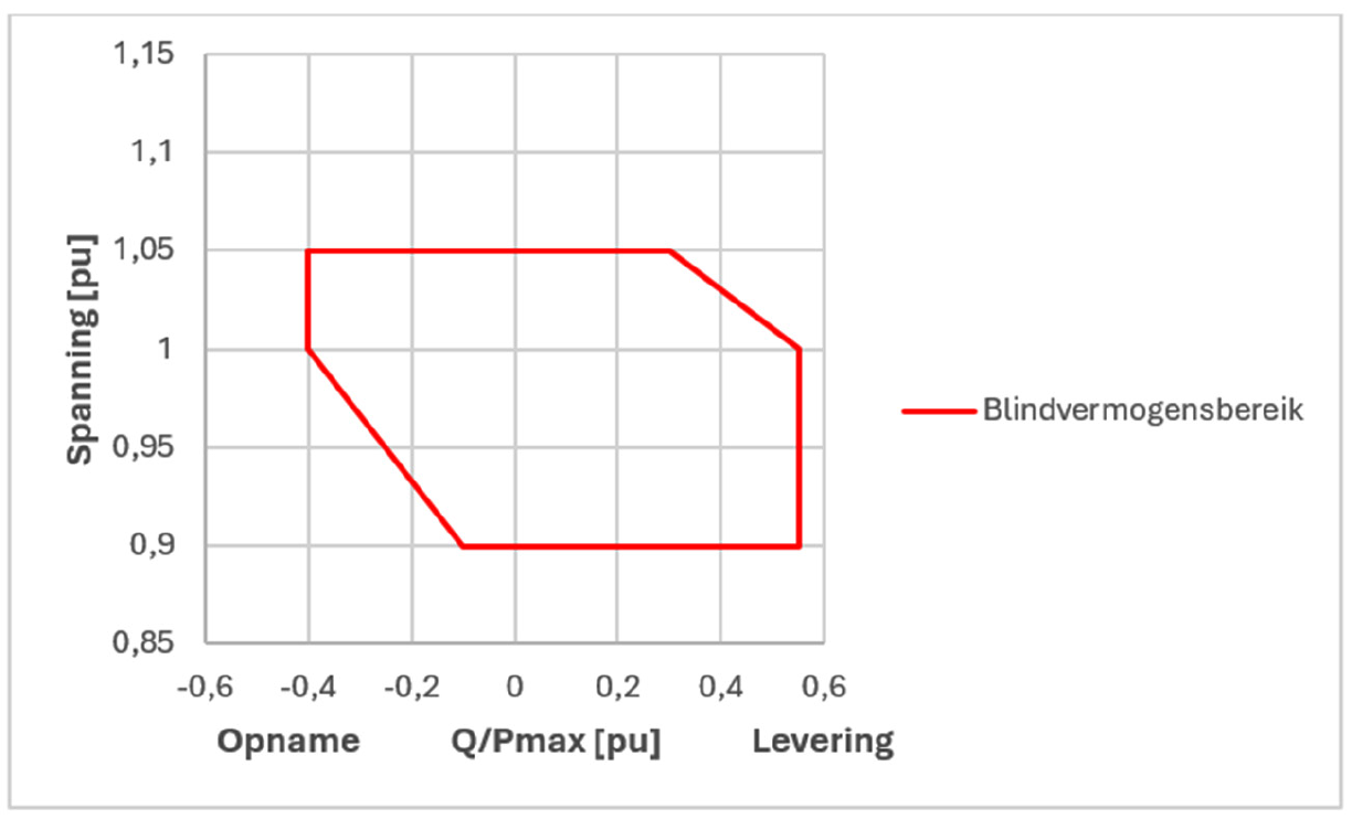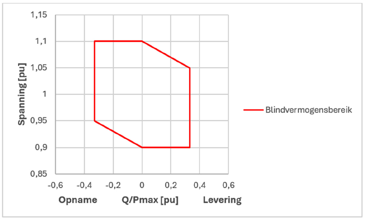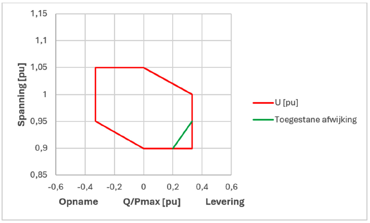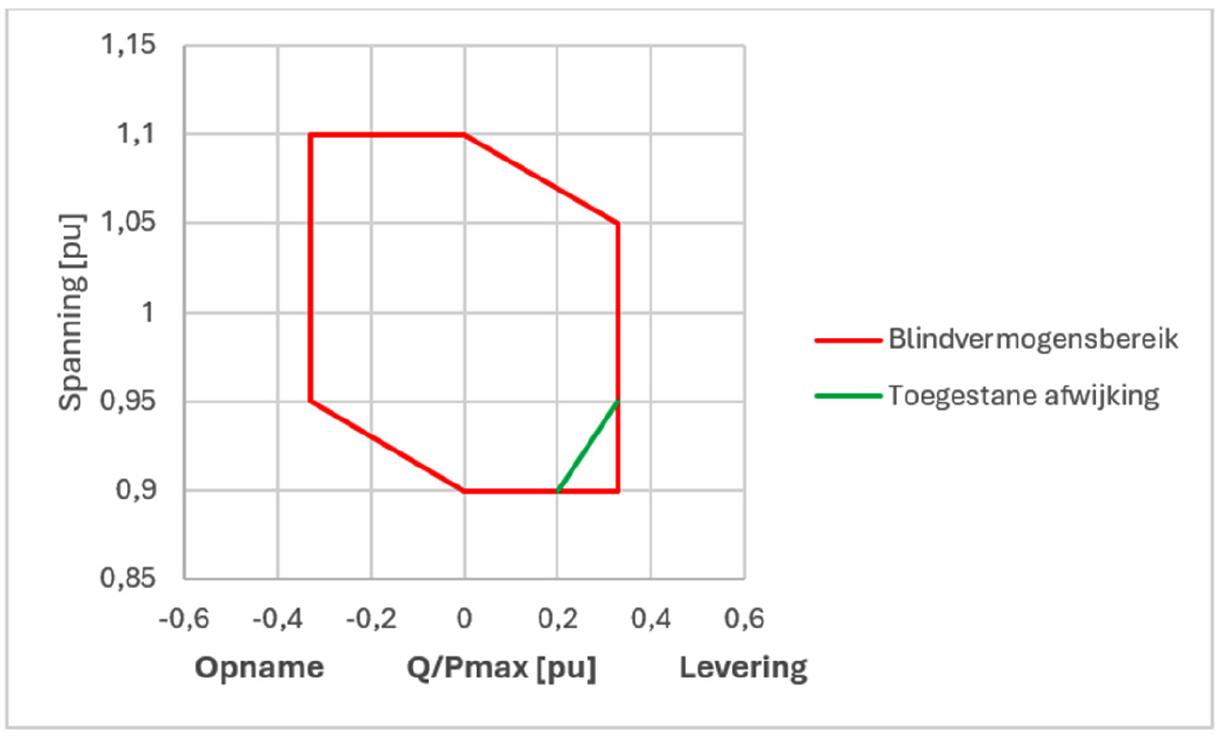 c. in afwijking van onderdeel a, juncto artikel 3.27, tweede tot en met vierde lid, is de synchrone condensor in staat bij variërende spanning ten minste een hoeveelheid blindvermogen te leveren dat gekenschetst wordt door een verhouding van blindvermogen tot maximaal schijnbaar vermogen gelijk aan 0,3 bij een spanning van 1,05 pu, gelijk aan 0,65 bij een spanning van 0,9 pu tot 1 pu en dat bepaald wordt door het lineaire verloop tussen respectievelijk 0,65 en 0,3 bij een spanning van 1 pu tot 1,05 pu, en een hoeveelheid blindvermogen op te nemen dat gekenschetst wordt door een verhouding van blindvermogen tot maximaal schijnbaar vermogen gelijk aan 0,1 bij een spanning van 0,9 pu, gelijk aan 0,5 bij een spanning van 1 pu tot 1,05 pu en dat bepaald wordt door het lineaire verloop tussen respectievelijk 0,1 en 0,5 bij een spanning van 0,9 pu tot 1 pu, en is daarmee in staat blindvermogen te leveren of op te nemen ten minste binnen en inclusief de grenzen van het rood gemarkeerde profiel in onderstaand U-Q/Smax-diagram: