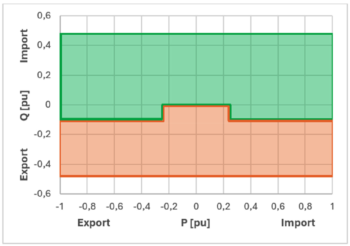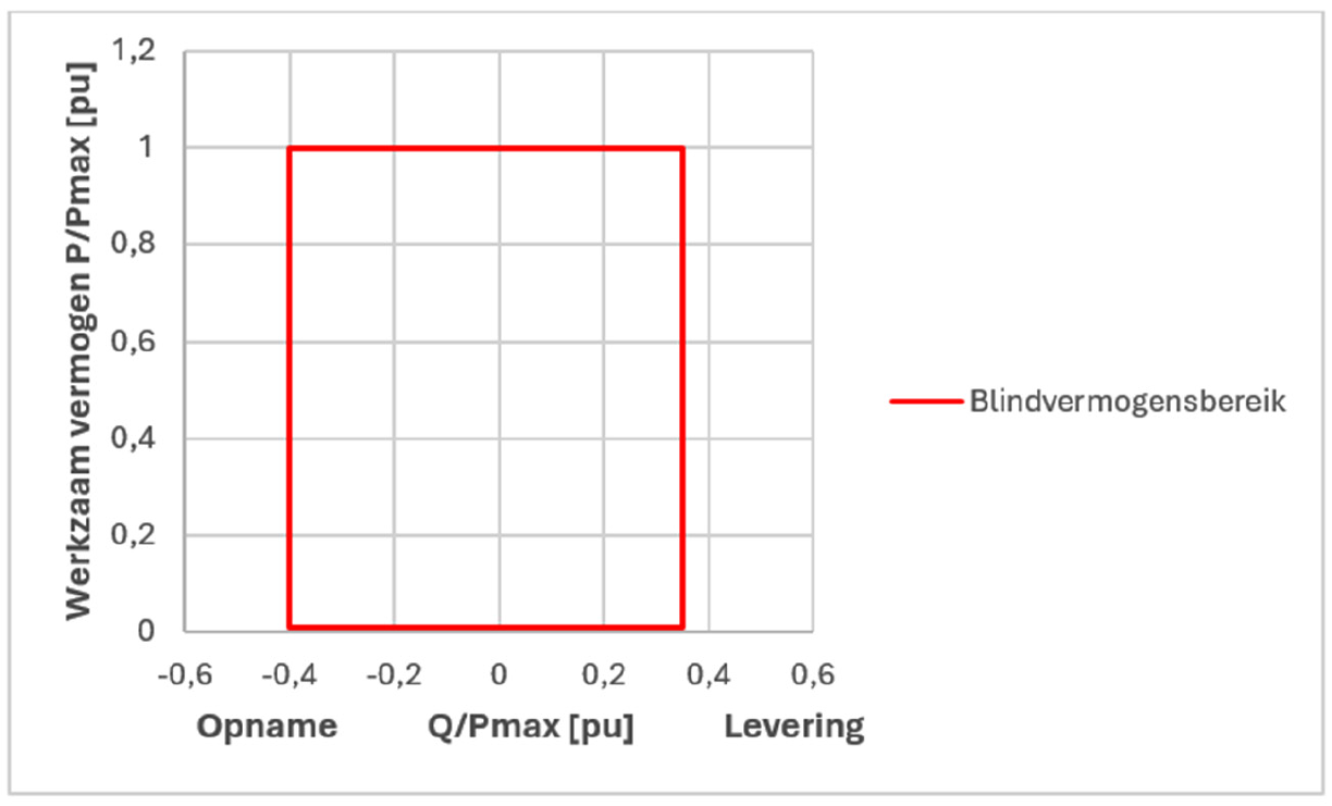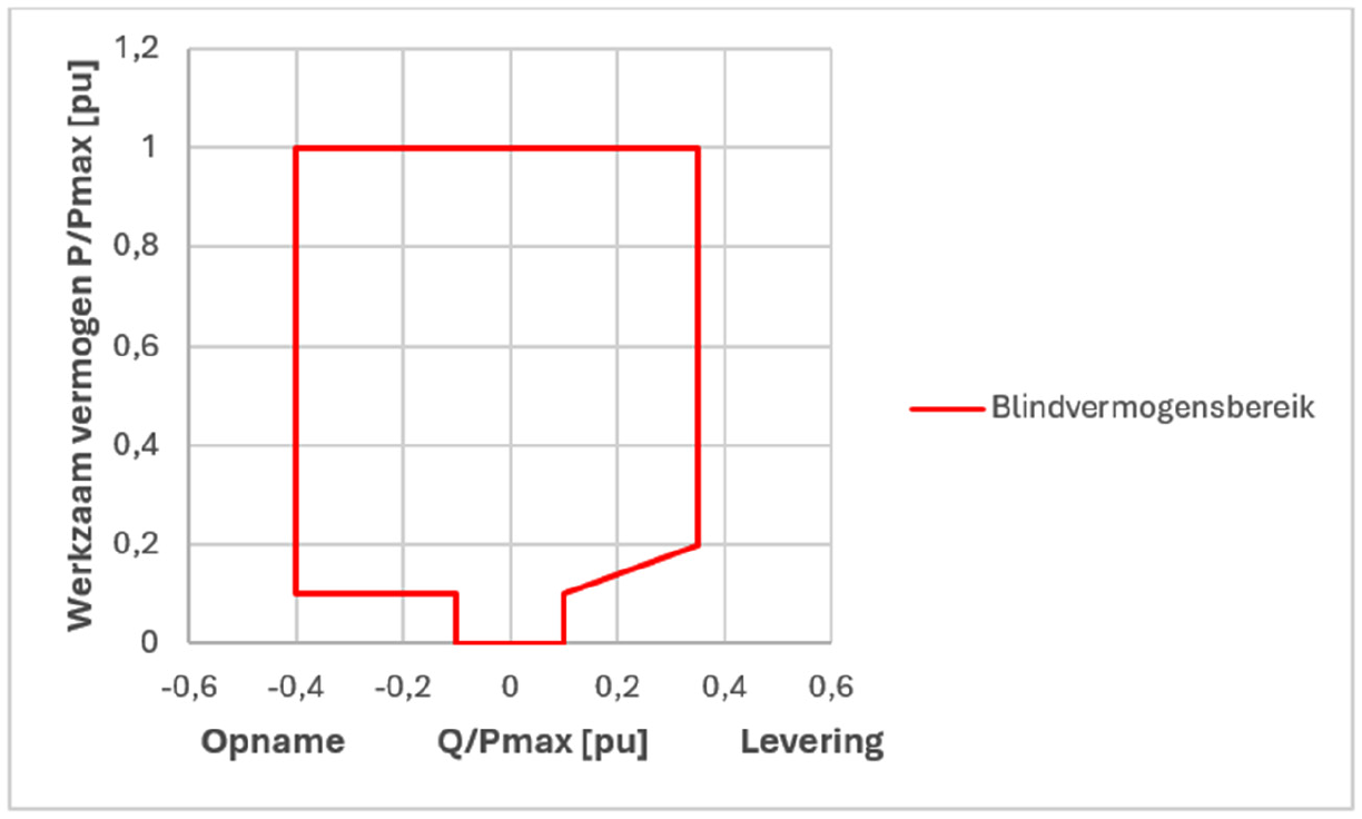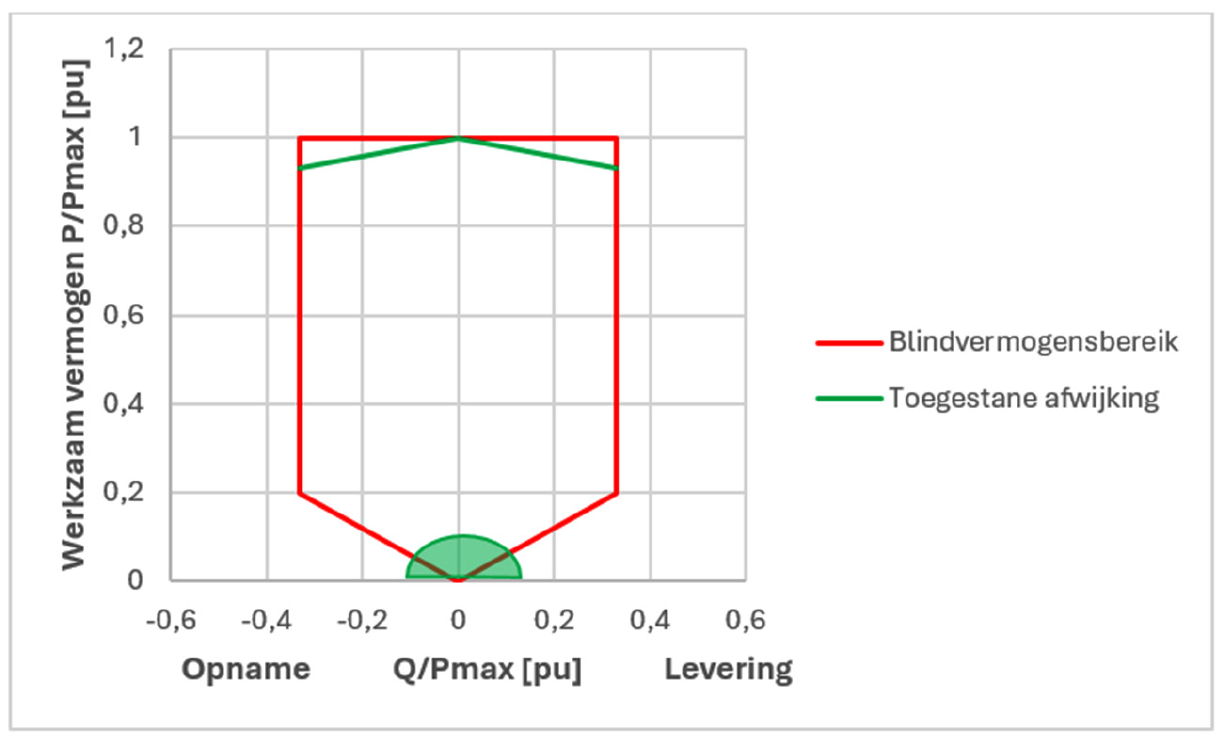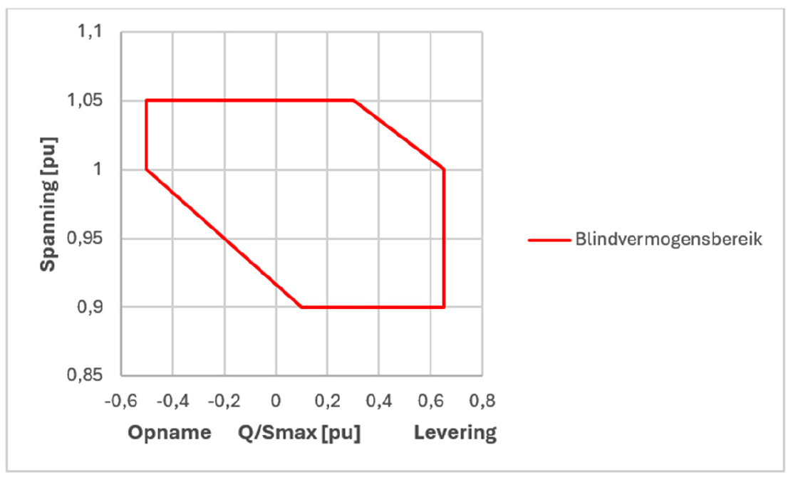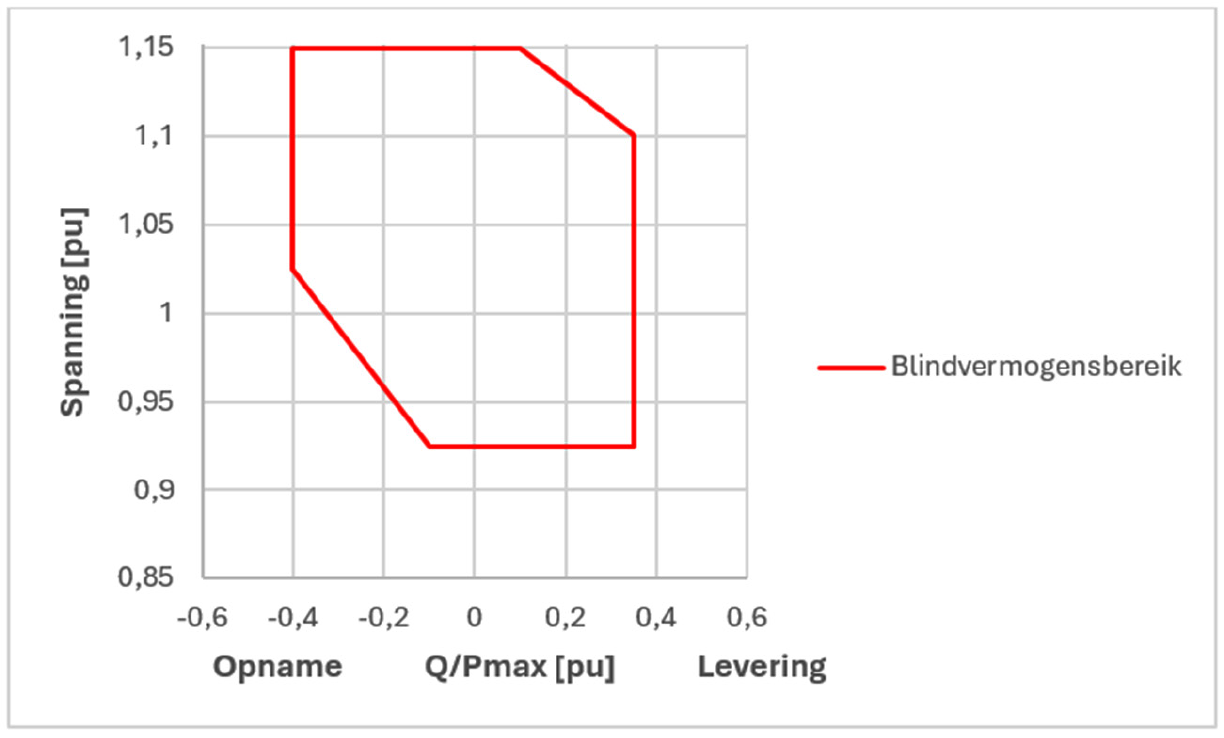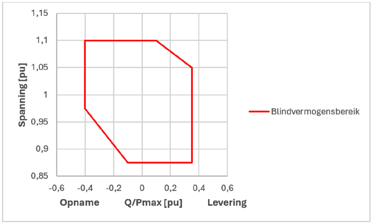 c. in afwijking van onderdeel a, juncto artikel 3.27, tweede tot en met vierde lid, is de synchrone condensor in staat bij variërende spanning ten minste een hoeveelheid blindvermogen te leveren dat gekenschetst wordt door een verhouding van blindvermogen tot maximaal schijnbaar vermogen gelijk aan 0,3 bij een spanning van 1,05 pu, gelijk aan 0,65 bij een spanning van 0,9 pu tot 1 pu en dat bepaald wordt door het lineaire verloop tussen respectievelijk 0,65 en 0,3 bij een spanning van 1 pu tot 1,05 pu, en een hoeveelheid blindvermogen op te nemen dat gekenschetst wordt door een verhouding van blindvermogen tot maximaal schijnbaar vermogen gelijk aan 0,1 bij een spanning van 0,9 pu, gelijk aan 0,5 bij een spanning van 1 pu tot 1,05 pu en dat bepaald wordt door het lineaire verloop tussen respectievelijk 0,1 en 0,5 bij een spanning van 0,9 pu tot 1 pu, en is daarmee in staat blindvermogen te leveren of op te nemen ten minste binnen en inclusief de grenzen van het rood gemarkeerde profiel in onderstaand U-Q/Smax-diagram:
