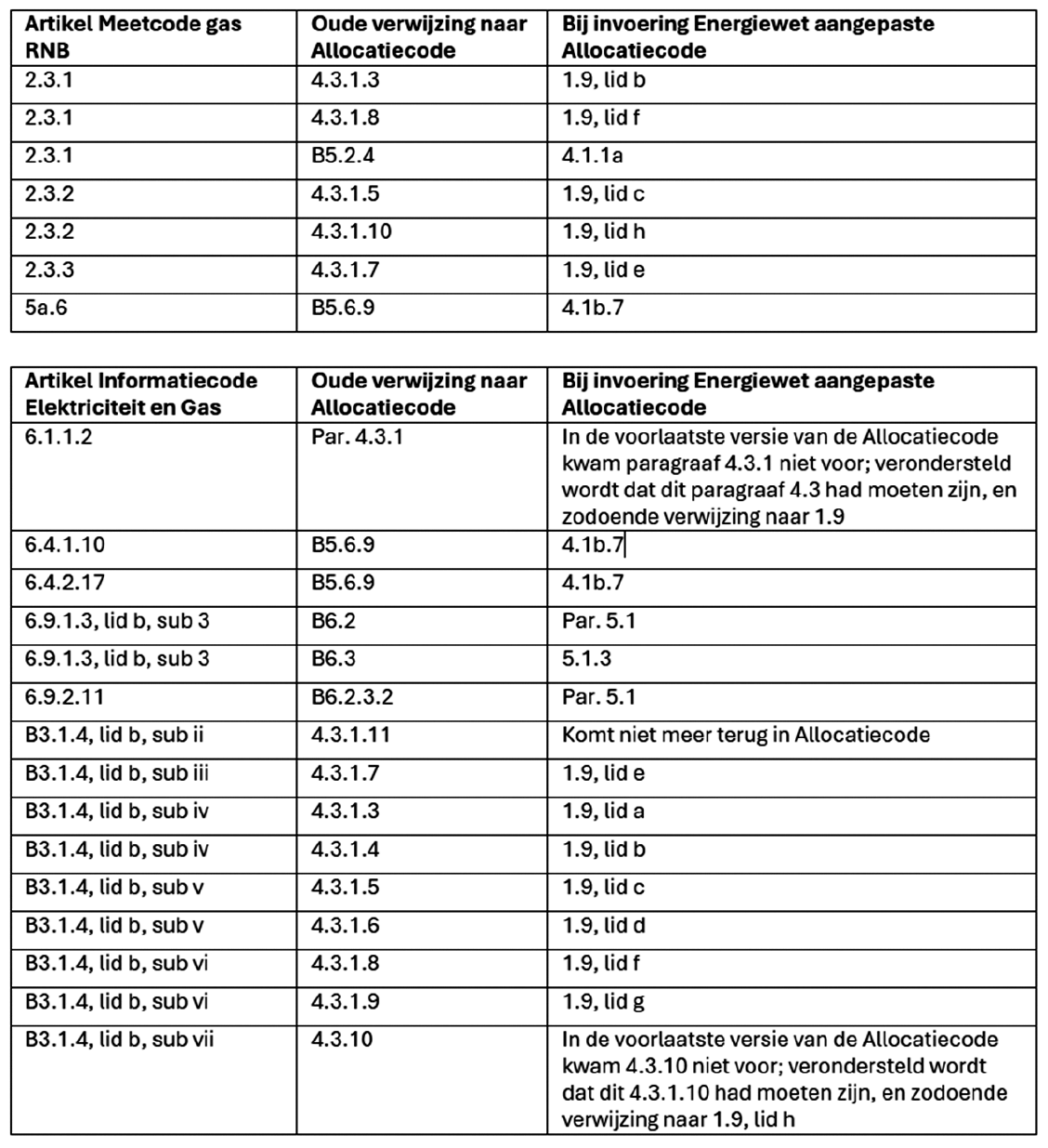 1.2a Vanwege wijzigingen in de Allocatiecode systeembeheerders gas als gevolg van invoering van de Energiewet, zijn verwijzingen vanuit de Meetcode gas RNB en vanuit de Informatiecode Elektriciteit en Gas naar de Allocatiecode systeembeheerders gas niet meer correct. De juiste nummering van de verwijzing is terug te vinden in de transponeringstabellen zoals opgenomen in Bijlage 6a Transponeringstabellen verwijzingen naar Allocatiecode systeembeheerders gas.