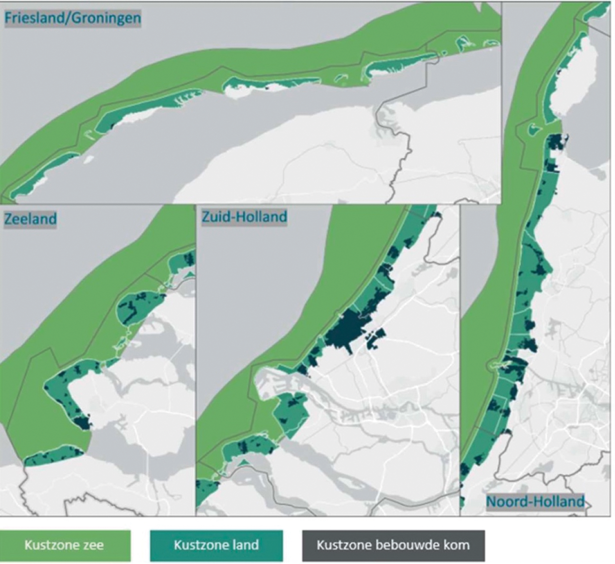 2. Zij hebben daarbij, ieder voor het tot de eigen provincie behorende deel van de kustzone, een zonering (buiten de bebouwde kom) opgesteld waarmee sturing wordt gegeven aan een passend gebruik van de kustzone. Met deze zonering wordt op basis van de kernkwaliteiten van de kustzone bepaald en inzichtelijk gemaakt in welke delen van de kustzone geen nieuwe recreatieve bebouwing is toegestaan en in welke delen wel en onder welke voorwaarden. De zoneringen op basis van het Kustpact zijn afgestemd met de zoneringen ten aanzien van de beheertaken van de waterkering beheerders. De actualisatie van het beleid en de zoneringen zijn vertaald in de provinciale verordeningen met regels voor de inhoud van gemeentelijke omgevingsplannen en bestemmingsplannen.