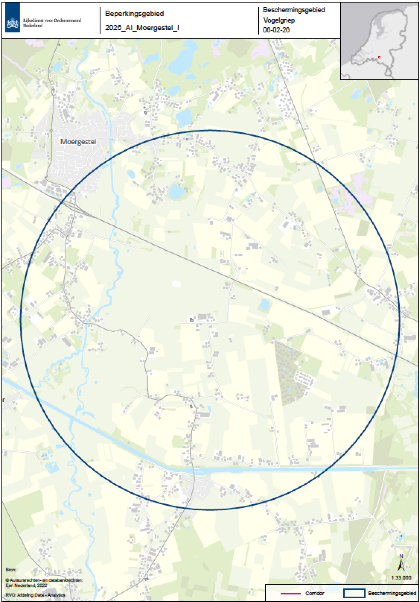 De beschermingszone en/of bewakingszone overlapt gedeeltelijk met de beschermingszone en/of bewakingszone die is aangewezen in de Regeling maatregelen beschermings- en bewakingszone hoogpathogene vogelgriep Oisterwijk 2026. Voor de uitbraak in Moergestel zijn aparte gebieden aangewezen. Op het moment dat de gebieden in Oisterwijk zijn ingetrokken, blijft duidelijk wat de gebieden in Moergestel zijn.