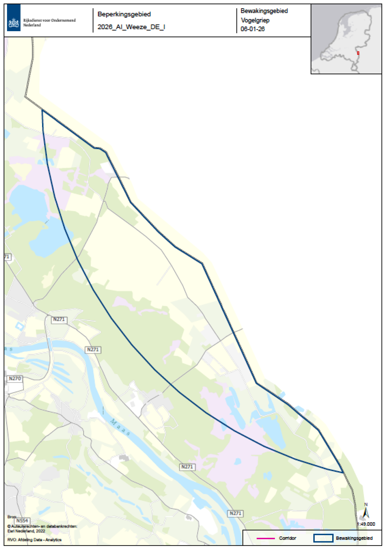 Eén van die maatregelen is het instellen van een beperkingszone die bestaat uit een bewakingszone rond de besmette inrichting in Weeze, Duitsland. De bewakingszone ligt voor een deel op Nederlands grondgebied. Voor dat deel is het aan de Minister van Landbouw, Visserij, Voedselzekerheid en Natuur om op grond van de Wet dieren de maatregelen te treffen.