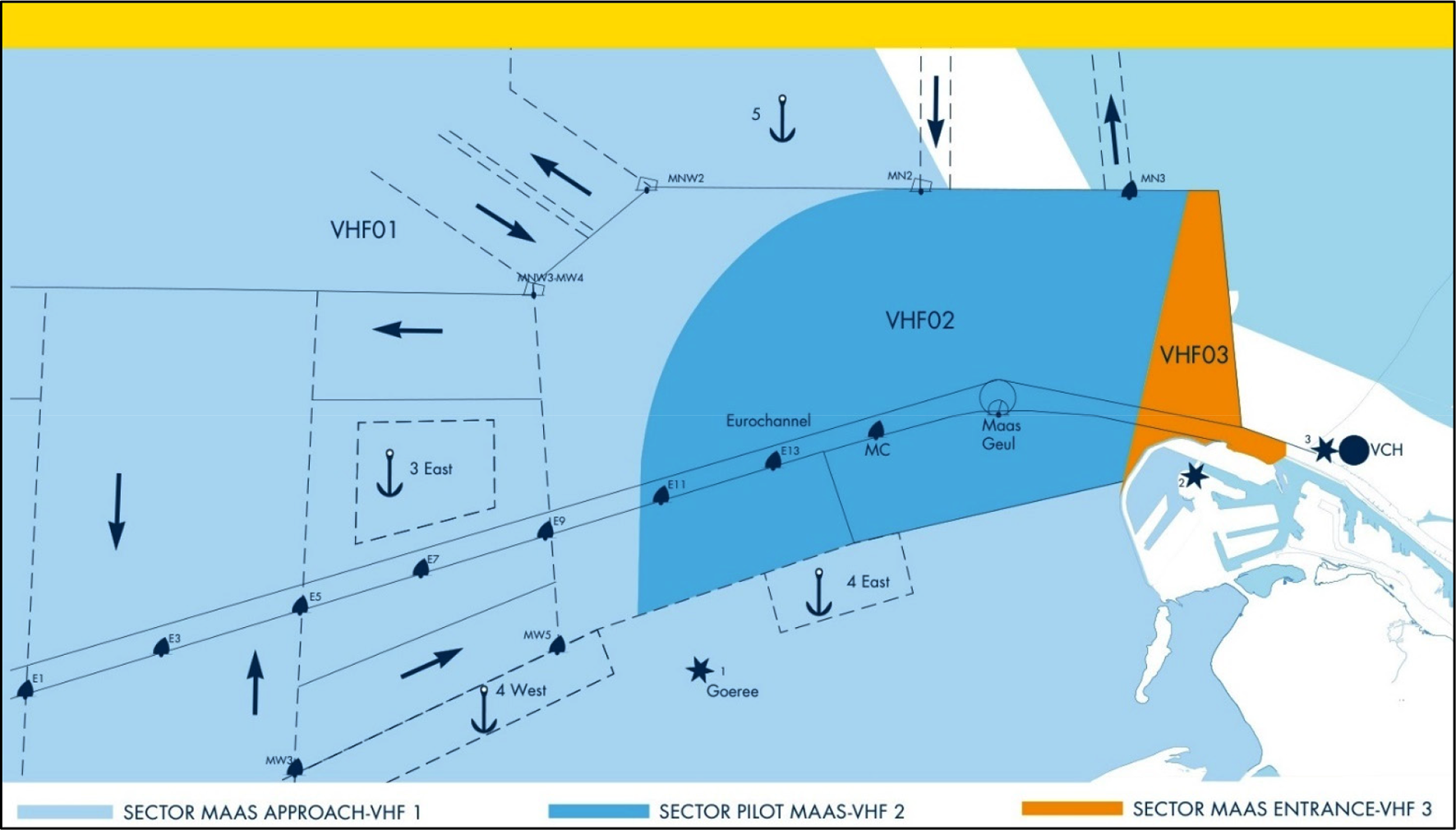 ○ Vanuit zee, VHF-kanaal 1 (sector Maas Aanloop).