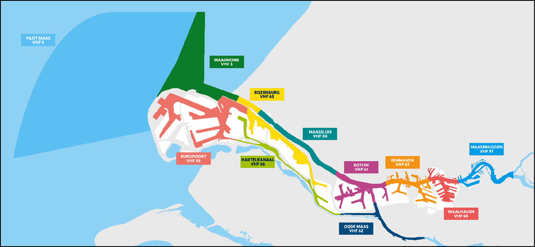 Binnen het havengebied Rotterdam, waar de vaarweg niet wordt gedekt door een VTS-sector, dient de scheepvaart uit te luisteren op VHF-kanaal 10 voor schip-schip communicatie.