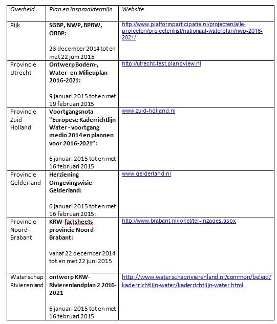 Genoemde plannen zijn in goede onderlinge afstemming tussen de verschillende overheden tot stand gekomen. Binnenkort liggen de verschillende plannen van rijk, provincies en waterschappen tegelijk ter inzage. Gevolg daarvan is dat er tussen 22 december 2014 en 22 juni 2015 inspraak mogelijk is op verschillende plannen met doelen en maatregelen om de waterkwaliteit in Nederland te verbeteren. Dat is mede het gevolg van de voorschriften uit Europese richtlijnen, met name de Kaderrichtlijn Water (KRW) en de Richtlijn OverstromingsRisico’s (ROR).