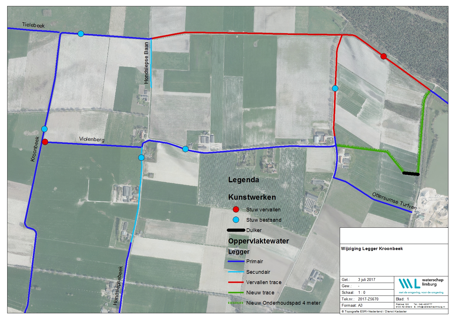Het dagelijks bestuur van Waterschap Limburg maakt, gelet op artikel 3:44 van de Algemene wet bestuursrecht (Awb) bekend, dat op 7 september 2017 onder een aantal voorschriften, een watervergunning is verleend voor het gedeeltelijk dempen (verleggen) van het oppervlaktewaterlichaam Kroonbeek en het maken en hebben van een duiker in de gemeente Gennep. De watervergunning is geregistreerd onder zaaknummer 2017-Z5670. Omdat de aangevraagde handeling in het watersysteem leidt tot een wijziging van de legger als bedoeld in artikel 5.1 van de Waterwet en artikel 78 van de Waterschapswet, wordt bij besluit van 7 september 2017 de legger van oppervlaktewateren gewijzigd. Het leggerbesluit is ingeschreven onder zaaknummer 2017-Z5854.