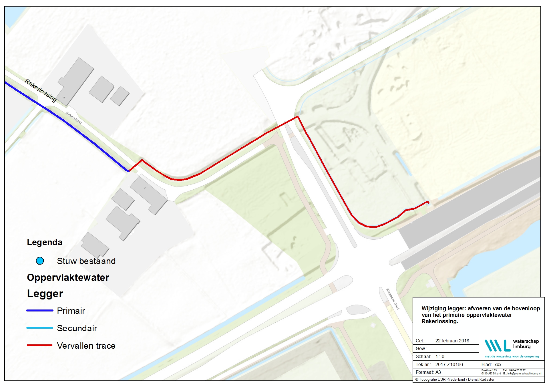 Het dagelijks bestuur van Waterschap Limburg maakt, gelet op artikel 3:44 van de Algemene wet bestuursrecht (Awb) bekend, dat op 11 mei 2018 een besluit is vastgesteld waarbij de legger van oppervlaktewateren is gewijzigd. Deze leggerwijziging betreft het van de legger afvoeren van de bovenloop van het primaire water genaamd Rakerlossing en het op de legger plaatsen van hemelwaterbuffers van het bedrijventerrein Kampershoek Noord te Weert in de gemeente Weert. Het leggerbesluit is ingeschreven onder zaaknummer 2017-Z10166.