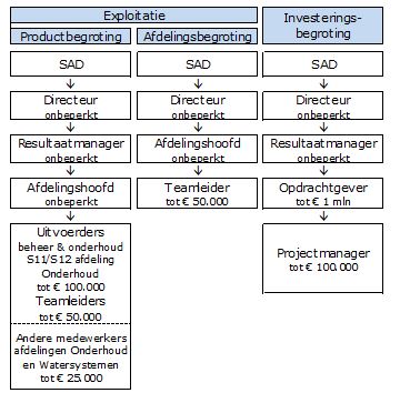 De resultaatmanagers zijn gemandateerd voor de productbudgetten. Na het maken van resultaatafspraken met de afdelingshoofden mandateren zij de budgetten door aan de afdelingshoofden.