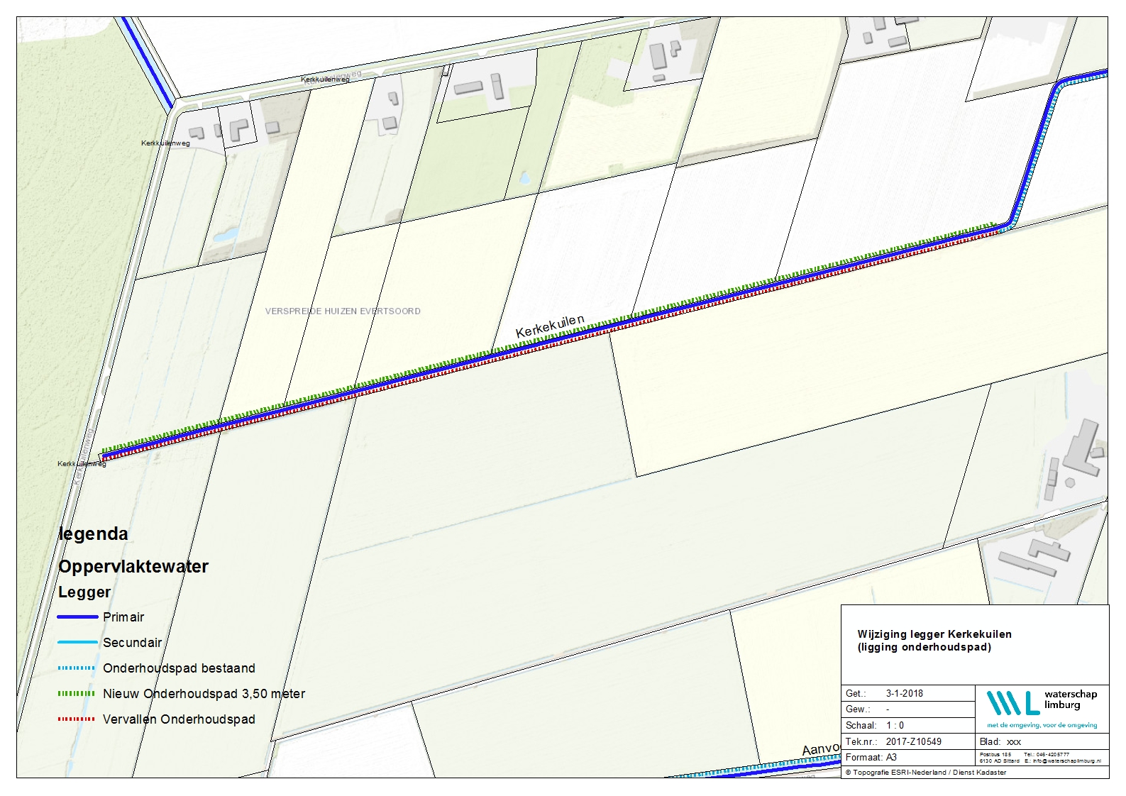 Het dagelijks bestuur van Waterschap Limburg maakt, gelet op artikel 3:44 van de Algemene wet bestuursrecht (Awb) bekend, dat op 18 september 2018 een besluit is verleend voor het wijzigen van de legger van oppervlaktewateren. Deze leggerwijziging betreft het in de legger wijzigen van de ligging van het onderhoudspad langs het oppervlaktewater genaamd Kerkekuilen (deels) in de gemeente Horst aan de Maas. Het leggerbesluit is ingeschreven onder zaaknummer 2017-Z10549.
