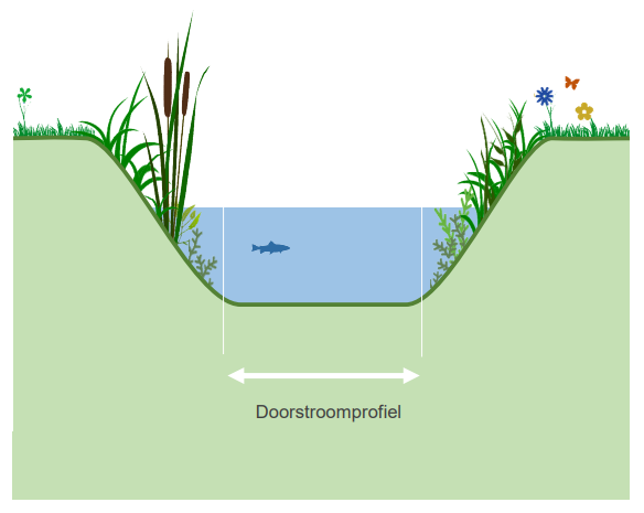 Eigenaren van gronden langs de te controleren watergangen moeten de sloot en de aanwezige duikers vrijhouden van overtollige begroeiing, vuil en andere materialen die de vrije doorstroming van het water belemmeren. Het doorstroomprofiel van het water moet vrij zijn, zie tekening. Dit controleert het waterschap elk jaar vanaf 1 december tijdens ‘de schouw’, de controleronde.