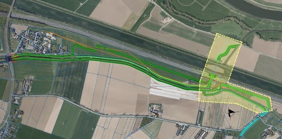 Onderstaande kaart toont het beoogde tracé en zoekgebied van de herinrichting Geleenbeek. Het betreft een tracé van ongeveer 1,6 km van Oud Roosteren (links) tot aan de corridor (geel gearceerd gebied) en ca 300 meter voor het tracé Middelsgraaf (blauw gearceerd, rechterzijde). Parallel aan het gebied lopen de A2 en het Julianakanaal.