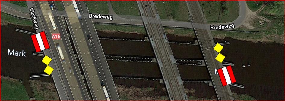 Het dagelijks bestuur van waterschap Brabantse Delta besluit om Verkeersteken A.1 (bord met twee rode vlakken en één wit vlak) aan te brengen aan de A16 en spoorbrug over de rivier de Mark zoals hieronder aangegeven: