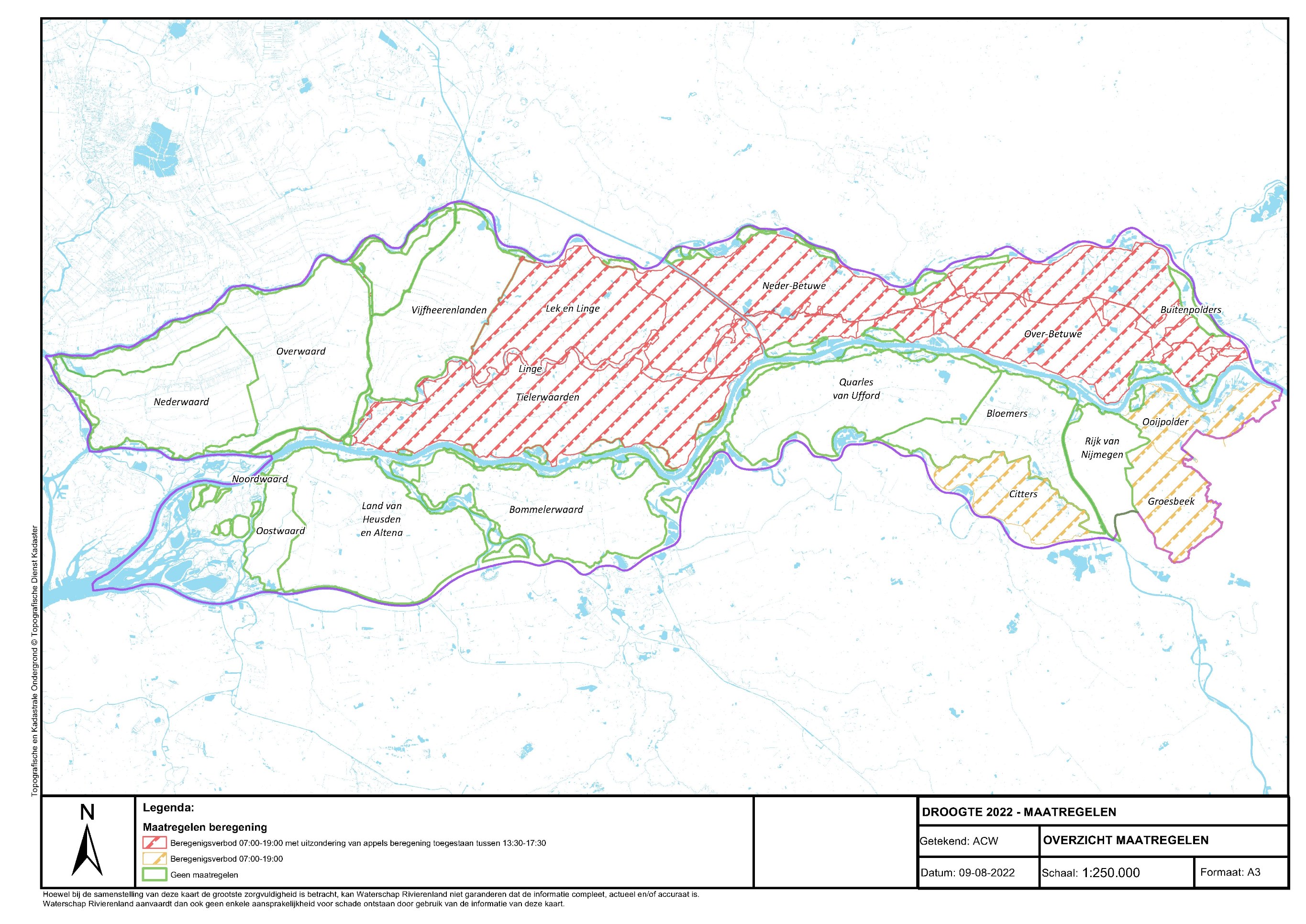 een verbod in te stellen tot het onttrekken van oppervlaktewater om te beregenen met ingang van 10 augustus 2022, dagelijks van 7.00 uur tot 19.00 uur tot een nader te bepalen datum, voor de volgende peilgebieden van Waterschap Rivierenland (zie bijgevoegde kaart):