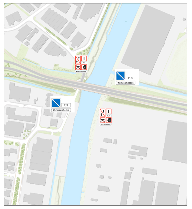Het dagelijks bestuur van waterschap Brabantse Delta besluit om gedurende de werkzaamheden tijdelijk de Verkeerstekens A2, A9, B8 (met onderbord F1), C5 (met onderbord F3) en E11 (met onderbord F3) (conform bijlage 7 van het Binnenvaartpolitiereglement) aan te brengen zoals hieronder aangegeven: