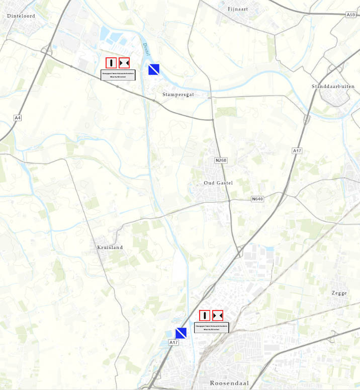 Het dagelijks bestuur van waterschap Brabantse Delta besluit om gedurende de werkzaamheden tijdelijk Verkeerstekens B.8, C3 (met onderbord F3 “(Bagger)werkzaamheden Mark/Dintel”) en E.11 aan te brengen zoals hieronder aangegeven:
