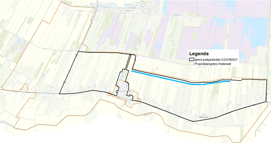 Figuur 1 1 . Grens projectplan gebied en GGOR2021, in het blauw de te realiseren watergang.