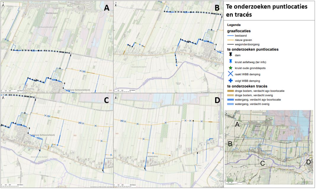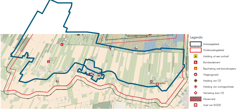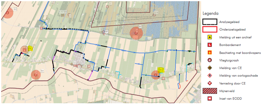 De voor Conventionele explosieven verdachte locaties zijn getoetst aan de kaart waarop de nieuw aan te leggen watergangen zijn geprojecteerd. Op basis van de vergelijking kan geconcludeerd worden dat het plangebied samenvalt met het invloedsgebied van een bombardement (locatie B6 in afbeelding 4.4) en het invloedsgebied van een vliegtuigcrash (locatie B3 in afbeelding 4.4). Op deze locaties wordt nader onderzoek uitgevoerd. Dit onderzoek is gepland uit te voeren nadat de gewassen van het maaiveld zijn gehaald. Het onderzoek zal in het najaar van 2022 gereed zijn.