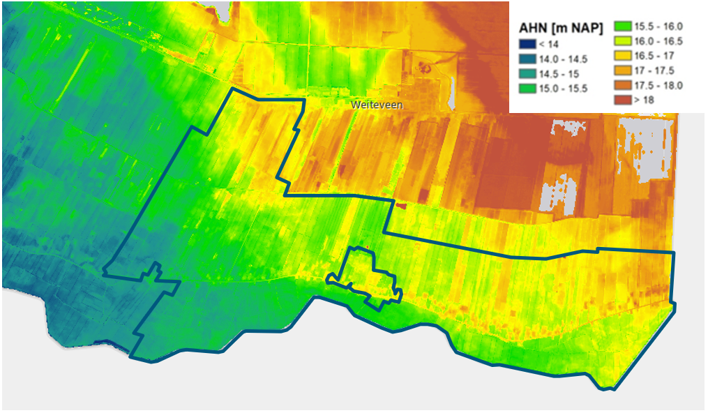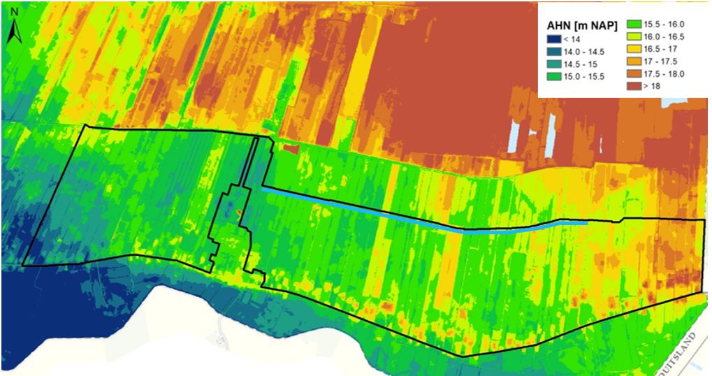 In Figuur 2 3 is te zien dat het plangebied voor het GGOR in zuidwestelijke richting afhelt, waarbij het laagste punt op circa 14 m NAP ligt. Het noordoostelijk deel van het gebied heeft een maaiveldhoogte van circa 17 m NAP. Het hoogteverschil van het maaiveld in het plangebied bedraagt circa 3 m. Ter plaatse van de te realiseren watergang verloopt het maaiveld van circa 15 m NAP op tot circa 17 m NAP.