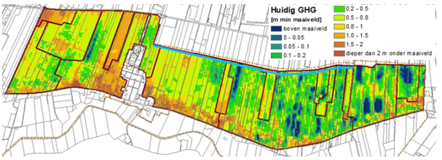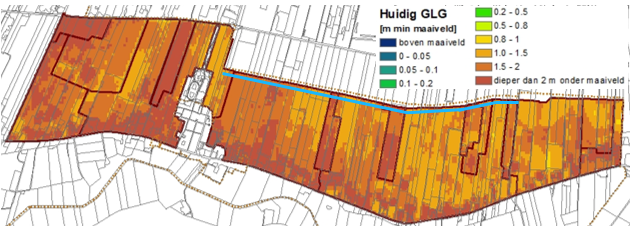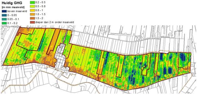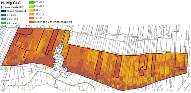 Figuur 4.1: Grondwaterstand (GLG) ten opzichte van veenbasis huidige situatie (RHDHV, 2022a)