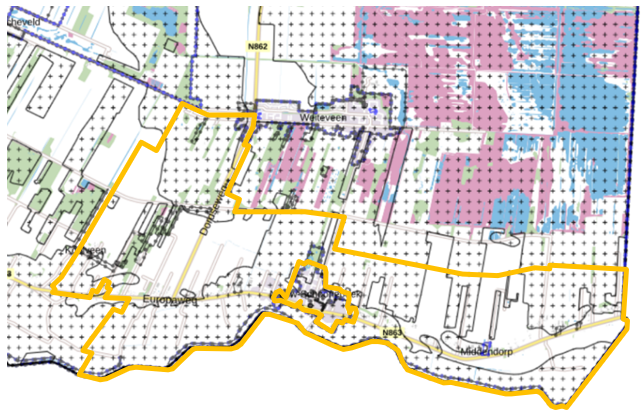 Figuur 2.10: Ontwerpbestemmingsplan Emmen, met gearceerd de gebieden met een waarde – archeologie 4 (Gemeente Emmen, 2022)