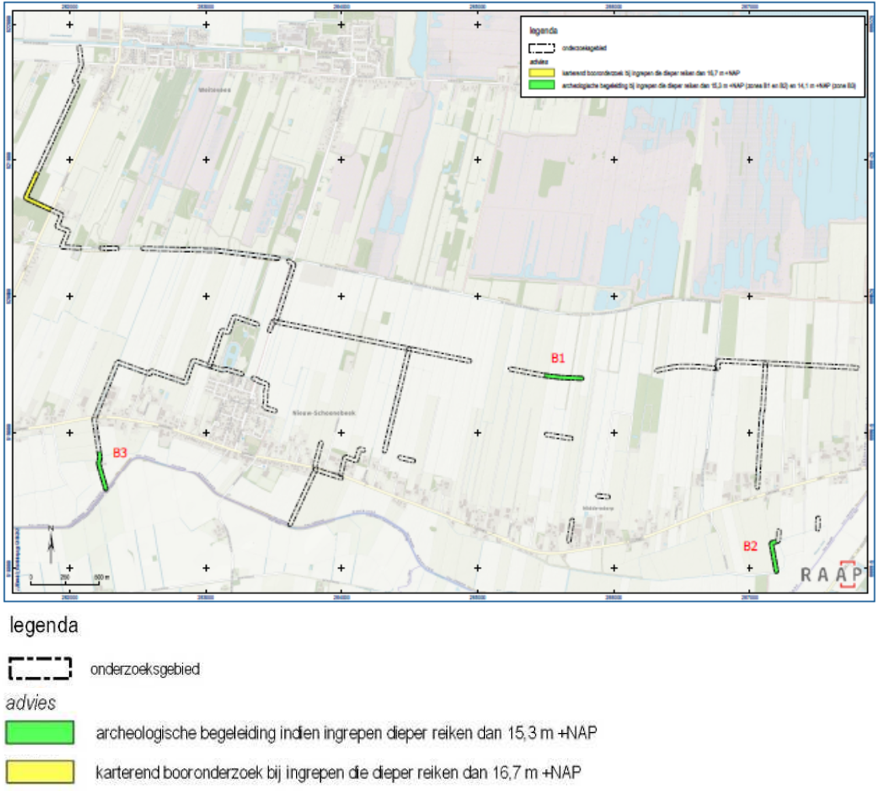De op de kaart geel gemarkeerde gedeelten (zie Figuur 4 1) betreffen intacte podzolbodems. De drie groen gemarkeerde delen betreffen zones met beekafzettingen. (Raap, 2021). De groene zone B1 ligt in de nieuwe watergang. Hiervoor is archeologische begeleiding voorgeschreven.