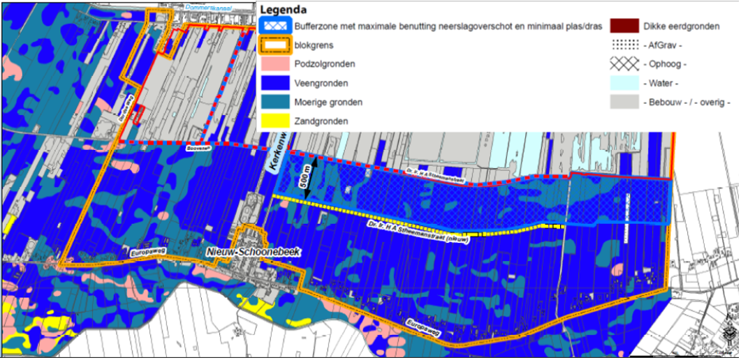 De bodem in het plangebied (Figuur 2 2) bestaat hoofdzakelijk uit veen afgewisseld met moerige gronden en een sporadische podzol. Dit houdt in dat het van nature overwegend nattere en iets zure gronden betreft waarbij met name voor de landbouw een goede afwateringstructuur van belang is. Door de bodemopbouw kan inklinking als gevolg van verdroging in het gebied optreden.