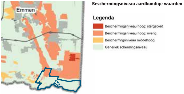 Uit de archeologische beleidsadvieskaart van de gemeente Emmen blijkt dat het plangebied voor een groot deel een middelhoge of hoge archeologische verwachtingswaarde (waarde -archeologie 4). In Figuur 2.10 zijn de gebieden weergegeven (met arcering) die de waarde – archeologie 4 hebben. Voor het uitvoeren van werken (die geen bouwwerken zijn) of van werkzaamheden geldt een verbod voor bodemingrepen met een oppervlakte van meer dan 1.000 m2 en dieper dan 30 centimeter. Voor de aanleg van deze werken dient met een archeologisch onderzoek aangetoond te worden dat er geen archeologische waarden geschaad worden (Gemeente Emmen, 2022).