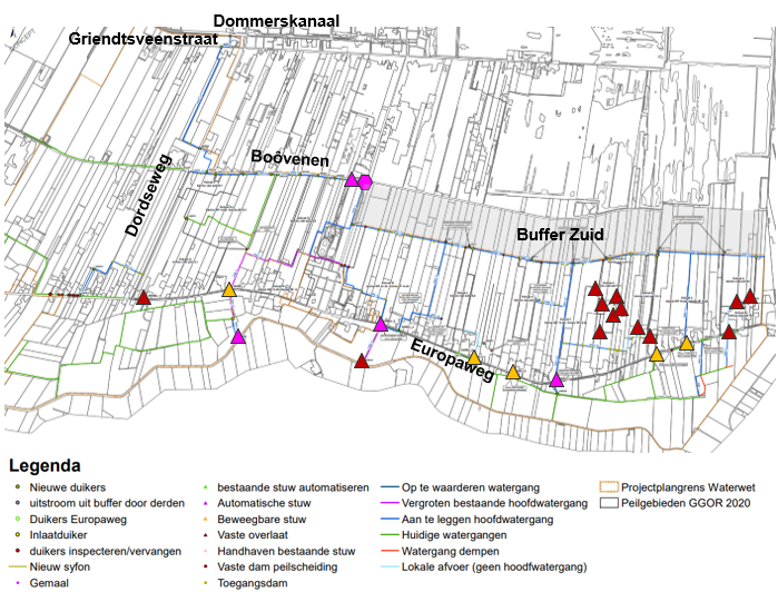 Onder de Boôvenen, de Dordseweg, de Bargerweg en de Griendtsveenstraat worden nieuwe duikers aangelegd. Onder de Europaweg waren (op één na) al duikers aangelegd. Deze duikers zijn van belang voor de afwatering van de nieuw aan te leggen watergangen. Daarnaast moeten enkele van deze bestaande duikers verlengd worden (zie Figuur 3.2).